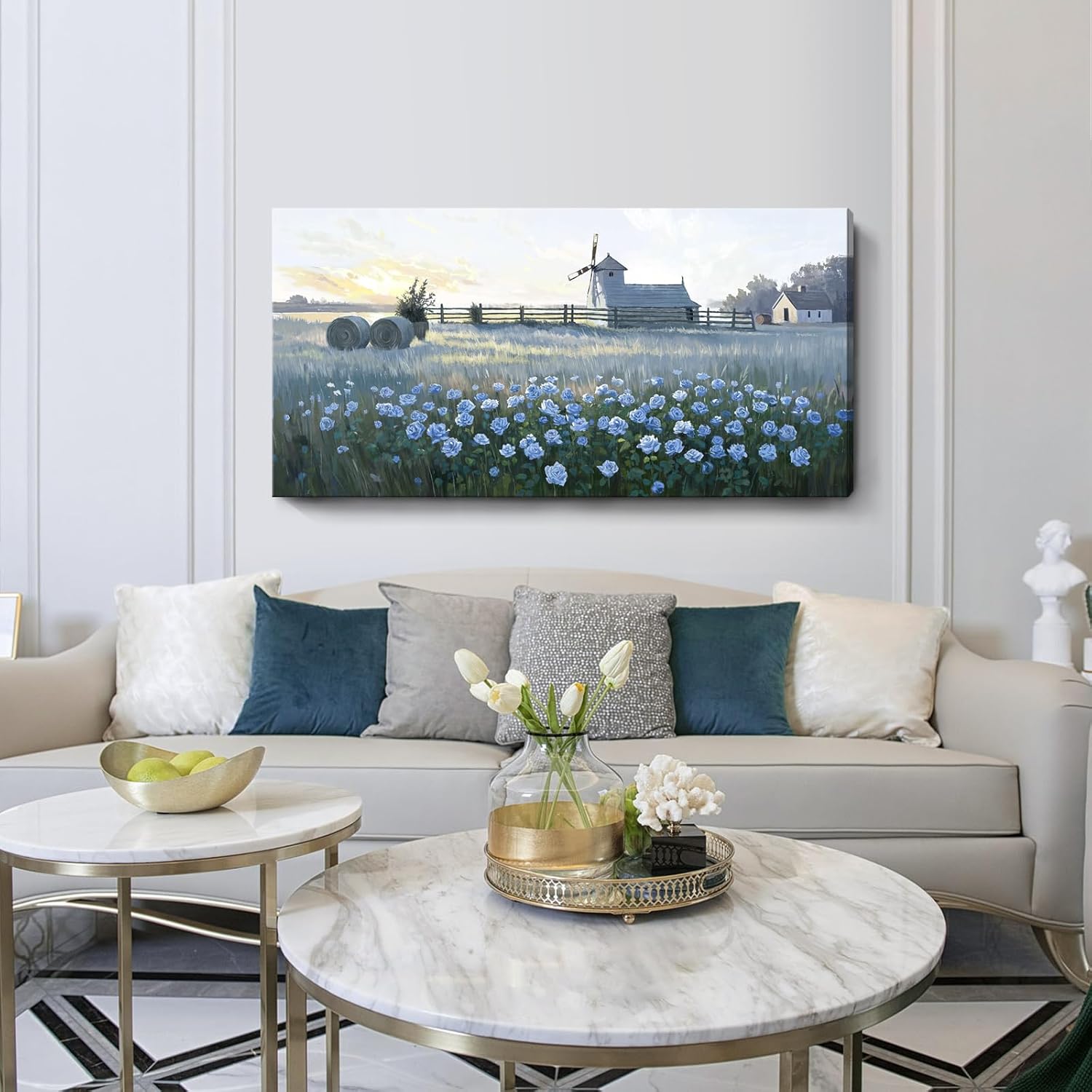 amatop Large Rustic Canvas Wall Art – Farmhouse Blue Rose and Windmill Landscape Picture, Nature Country Floral Sunset Wall Decor for Living Room Bedroom, Countryside Botanical Artwork Print 48x24 Inch