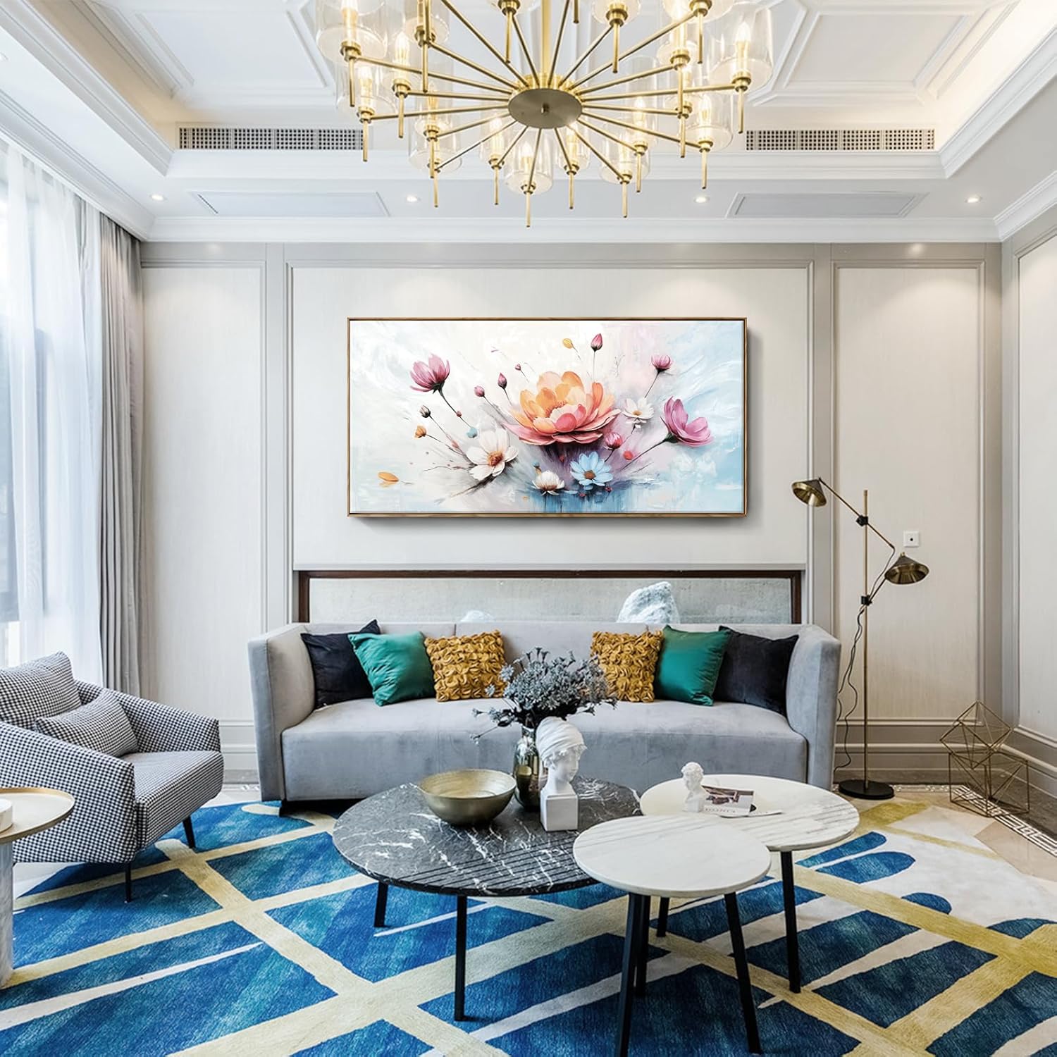 - An Eye-Catching Symphony of Color and Bloom: This oversized framed floral canvas features a bold central bloom surrounded by delicate blossoms and buds in soft pink, white, blue, and orange hues set against an abstract gradient background. It beautifully expresses life’s unfolding beauty. Let this artwork inspire calm, hope, and positivity, encouraging you to embrace change and bloom where you are planted.