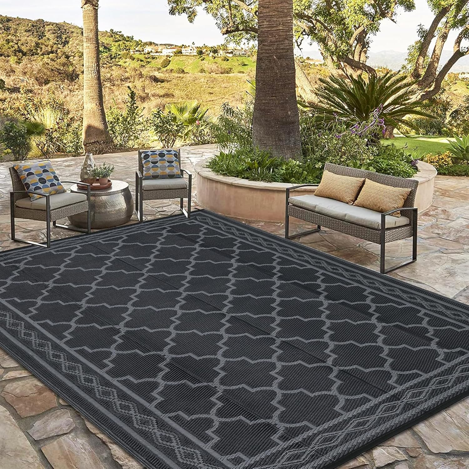 GAOMON Outdoor Plastic Straw Rug, 10'x14' Reversible Sage Green Patio Mat, Flower Modern Design for RV, Backyard, Deck, Camping, Picnic, Black/Grey(Geometric)