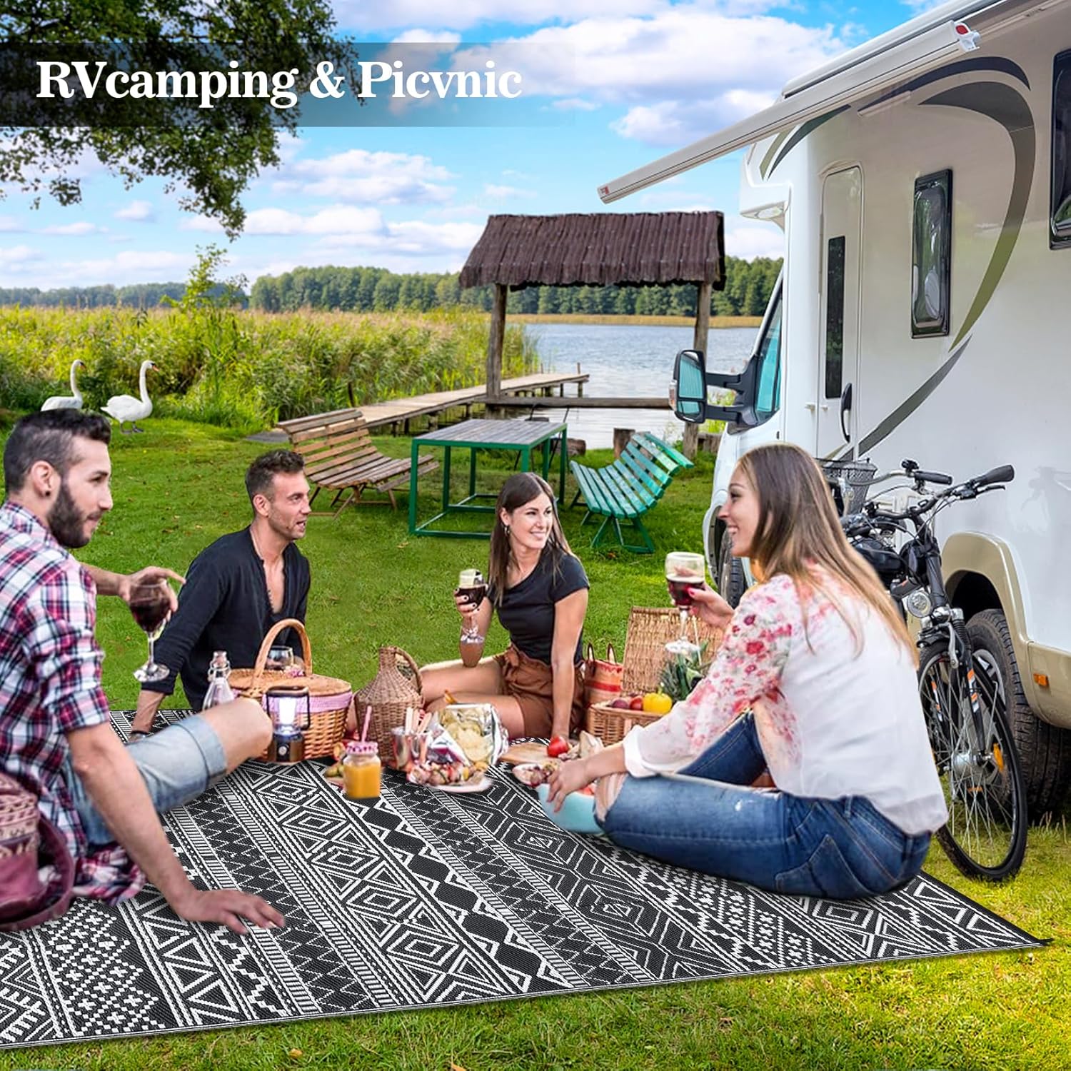 GAOMON Outdoor Rug Waterproof 8'x10', Reversible Outdoor Plastic Straw Rug, Boho Patio Rug, Indoor Outdoor Carpet, RV Mat Outside for Patio, Camp, Picnic, Balcony, Deck, Black/White(Bohemia)