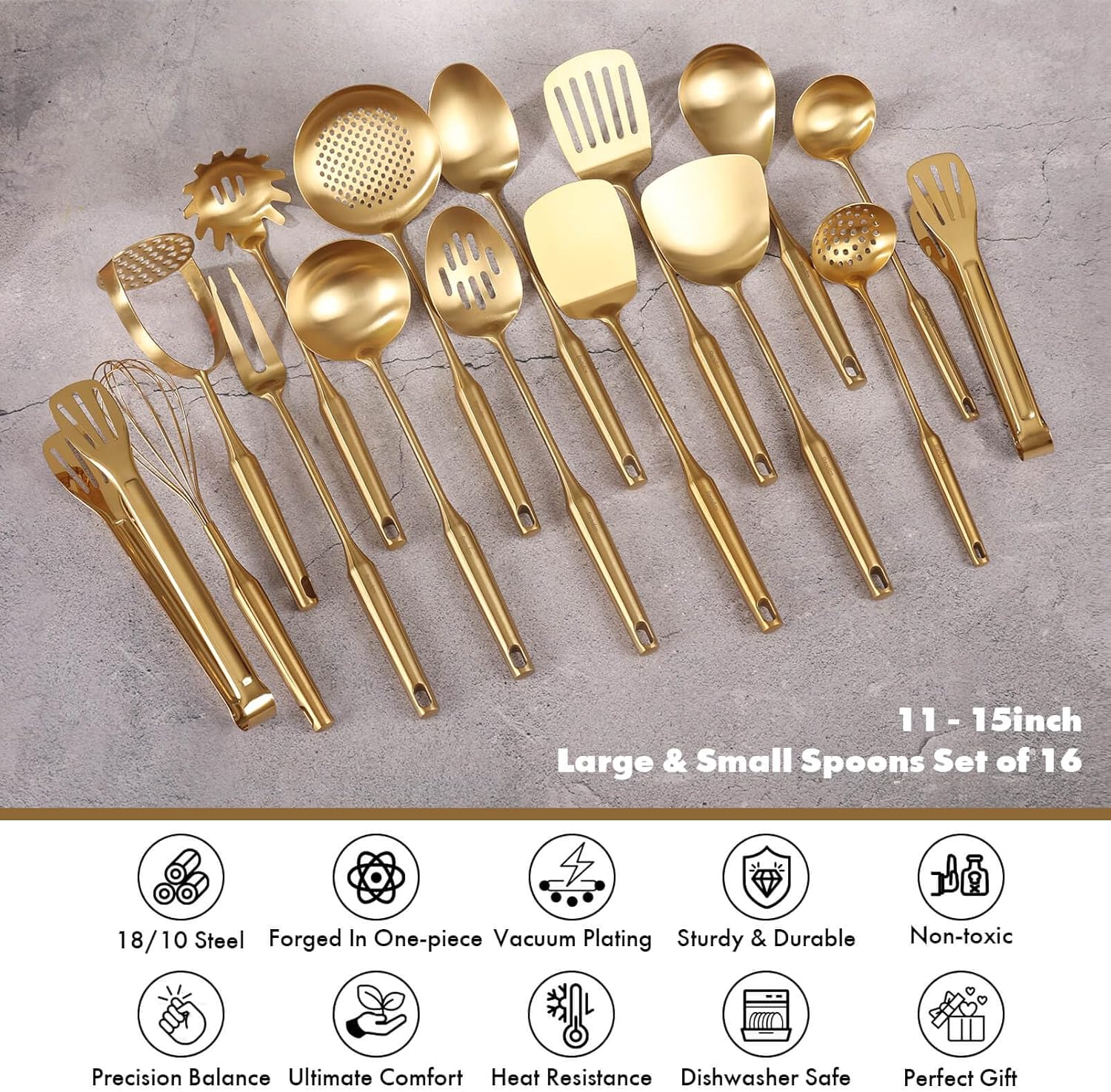 Gold Cooking Utensils Set - 18/10 Stainless Steel Large and Small Spoons Set, 16 PCS All Metal Kitchen Tools, Serving Utensils - Whisk, Masher, Fork, Tongs, Spatula, Ladle, Skimmer, Turner, Pasta