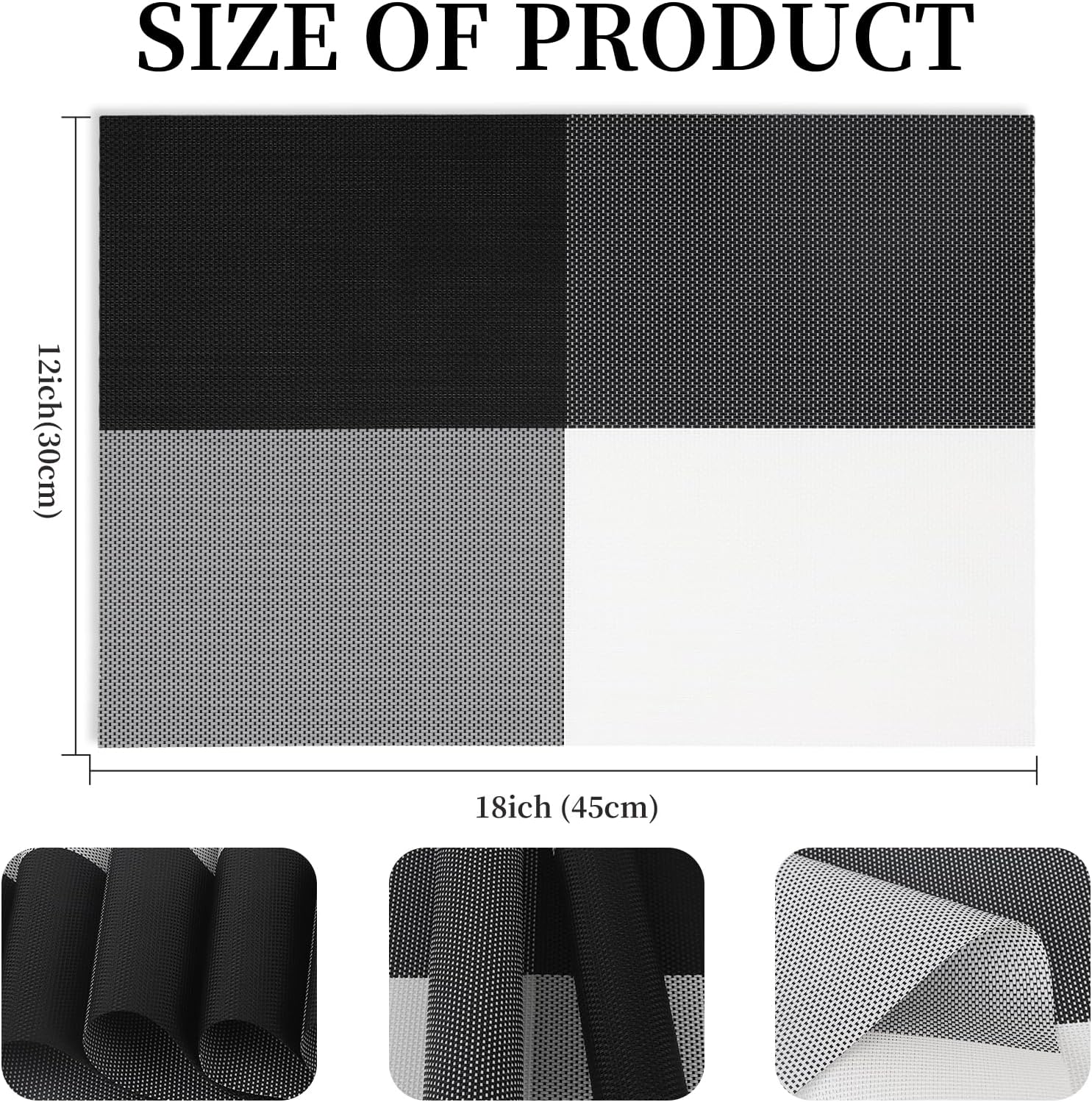 - 【Home Practical Decor】: Various types of modern textured and color placemats are available, 18x12 inch extra large rectangular perfect size set of 4 pieces placemats, is a decorative accessories of the table setting, both indoor and outdoor will be perfect for your dish or dinner plate size. These placemats can be rolled up through long storage and put away, will remain stay flat when spread out, very easy to store and carry around