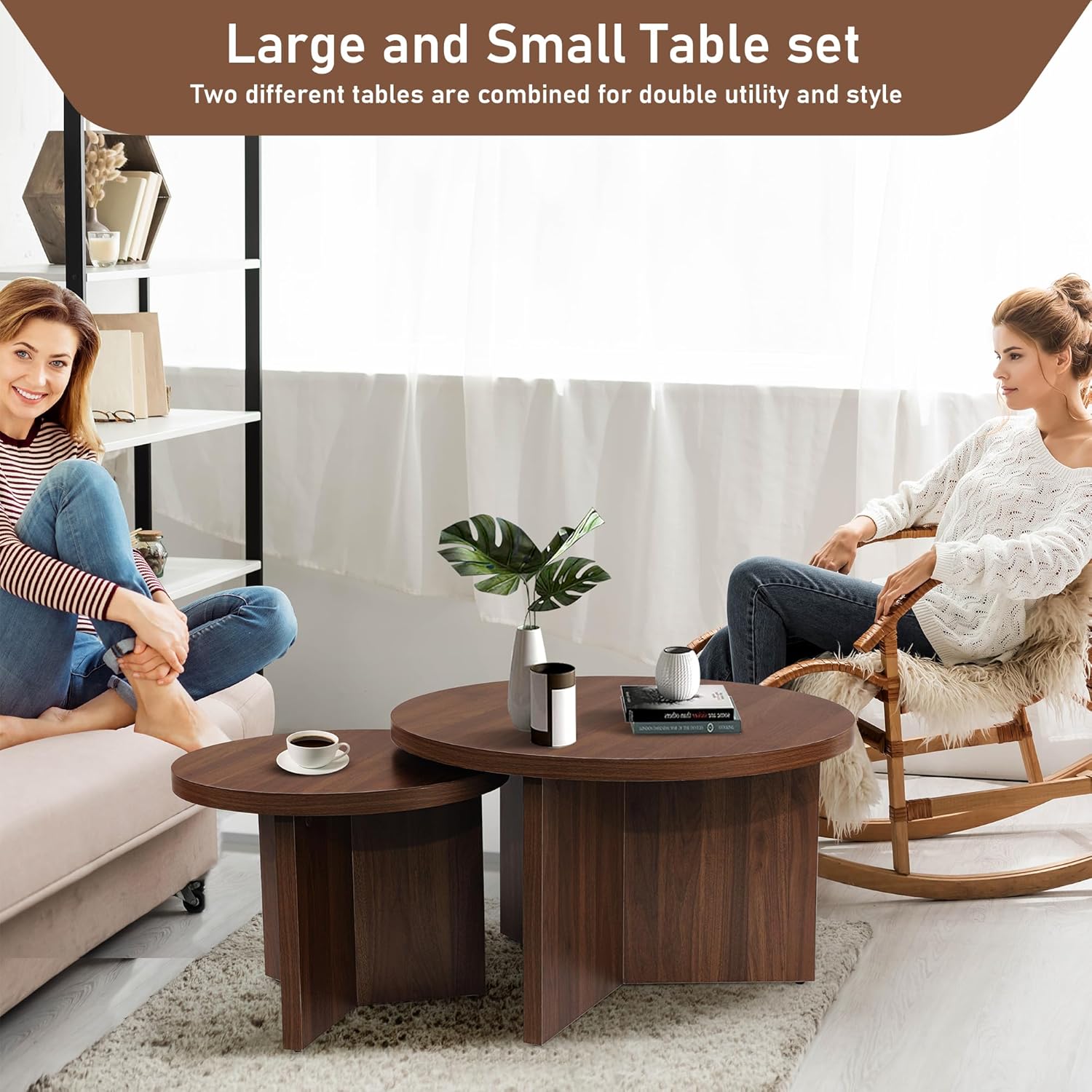 Round Nesting Coffee Tables Set of 2, Modern Stacking Table with Wood Grain Finish, End Table Side Tables for Living Room (Walnut)