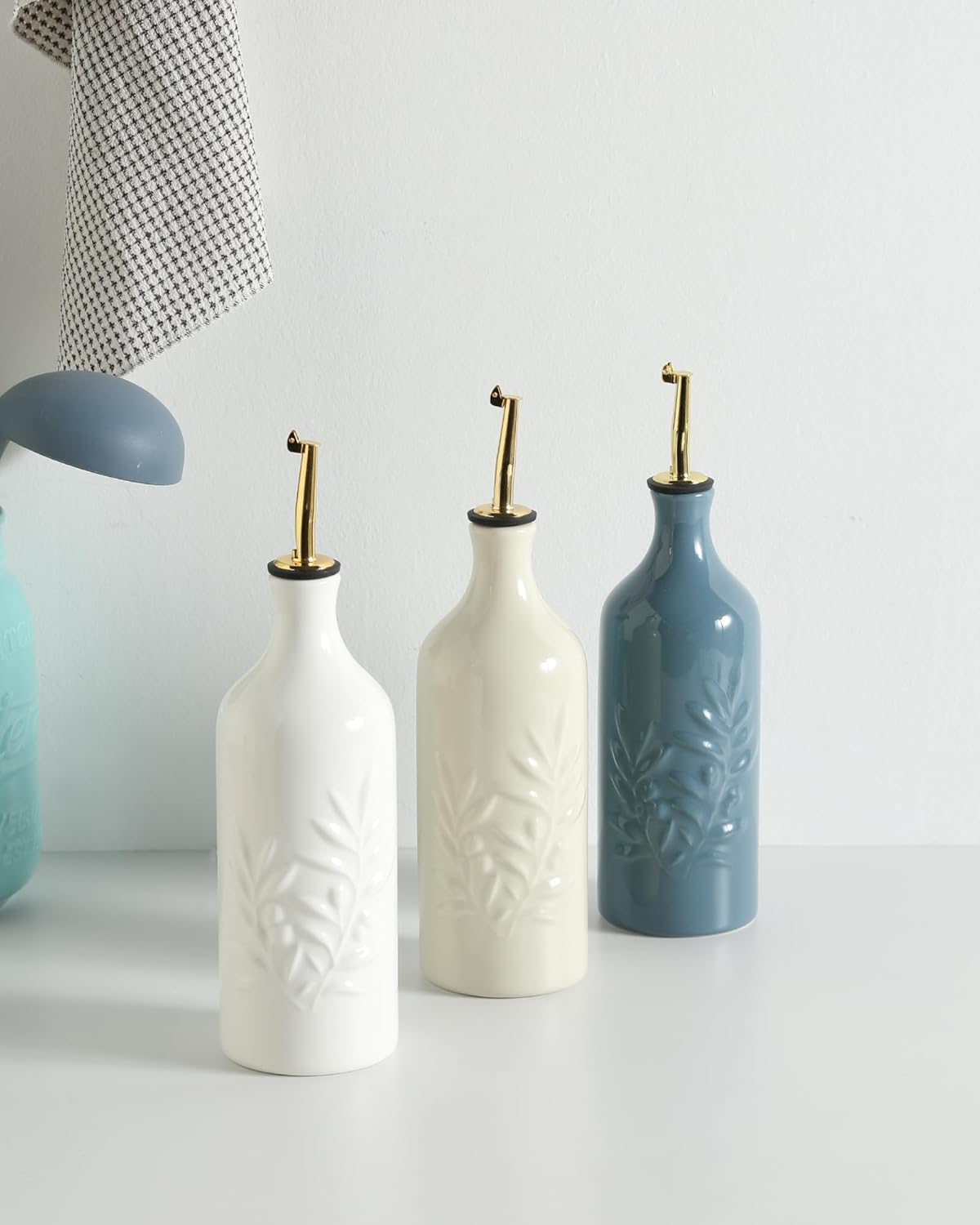 Sweejar Ceramic Olive Oil Dispenser Bottle 20 Oz Relief Opaque Oil Cruet Protects To Reduce Oxidation Suitable for Storage Vinegar, Soy Sauce, Coffee Syrup, Liquids, Set of 1 (Fogblue Gold Spout)
