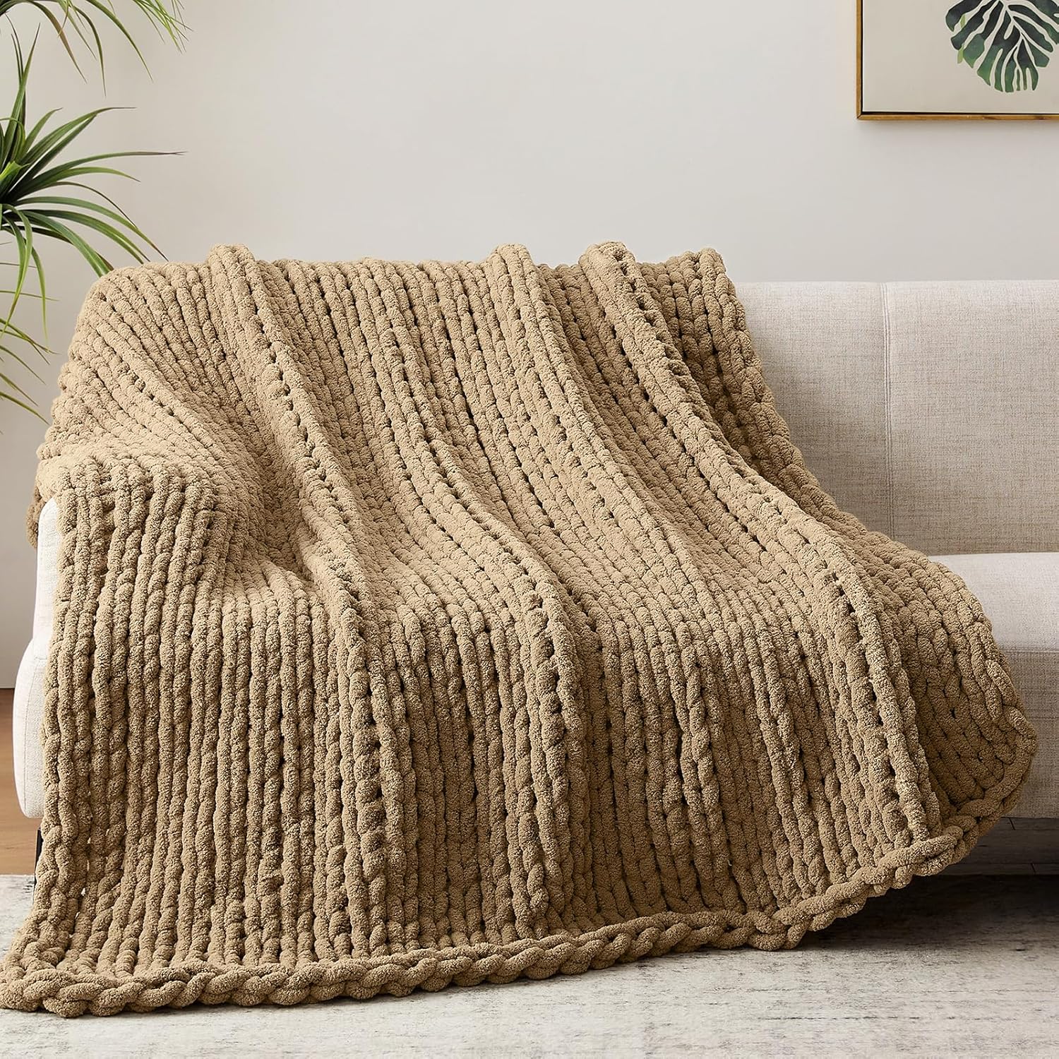 Chunky Knit Throw Blanket, 60''*80'' Knitted Throw Chenille Yarn for Bed Couch, Handmade Light Brown Crochet Big Thick Blanket, Machine Washable Cute Comfy Blanket for Home Decor