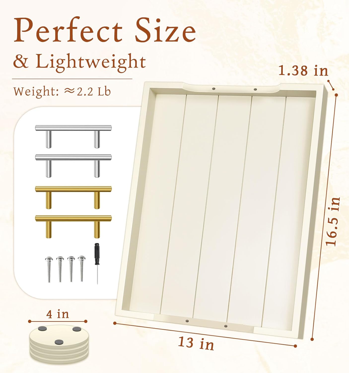 - 【SELECT YOUR HANDLE COLOR】Why not cost one money to get double happiness? Try our deluxe large white wooden tray for ottoman with 2 sets of metal handles. Now we offer two colors premium matte black and polished silver for replacement. Let's test your operational ability with the fantastic wood serving tray.