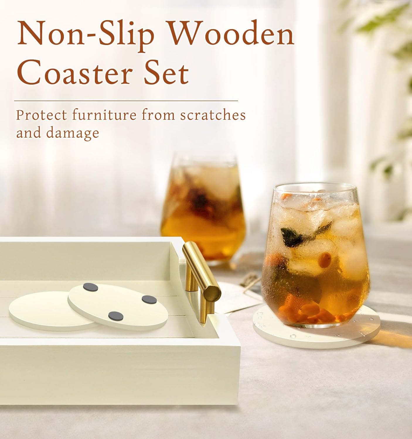 - 【HOW THOUGHTFUL THE 4 COASTERS ARE】Do you often get this trouble of mess and stained tables? Bring Sxnows large wooden ottoman tray for living room with 4 natural wood round coasters, no matter coffee table, dinner table, living room, or outdoor garden, always keep your furniture surfaces dry and clean. A sweet design is 4 cushions "feet" for non-slip and protection.