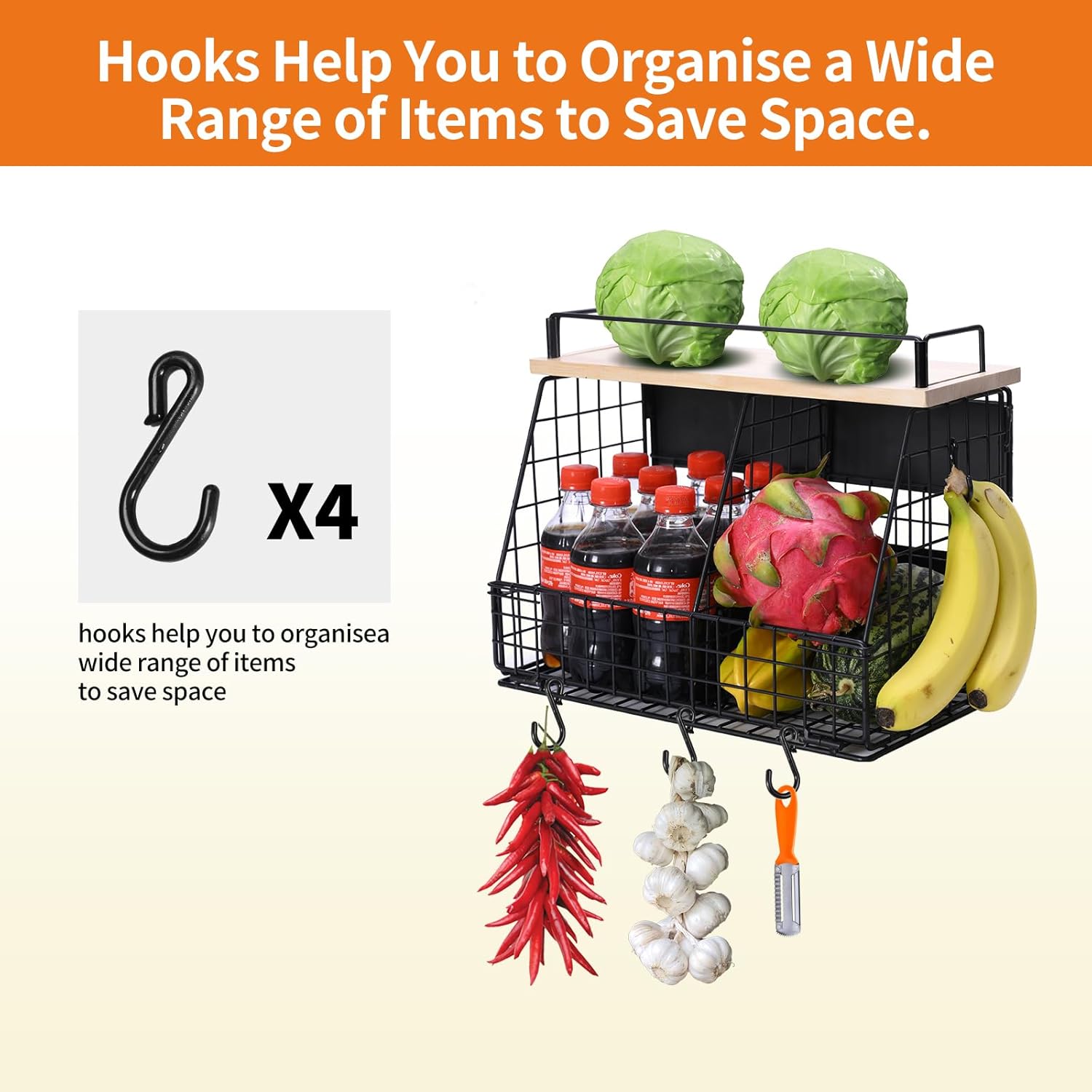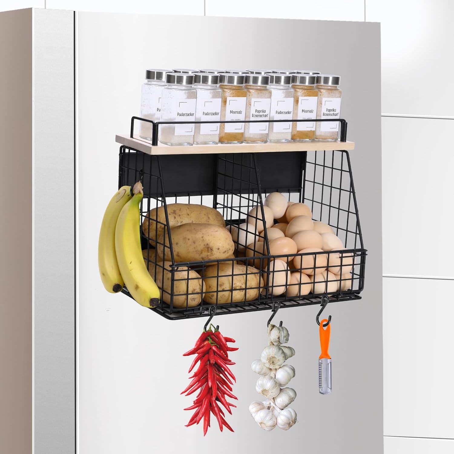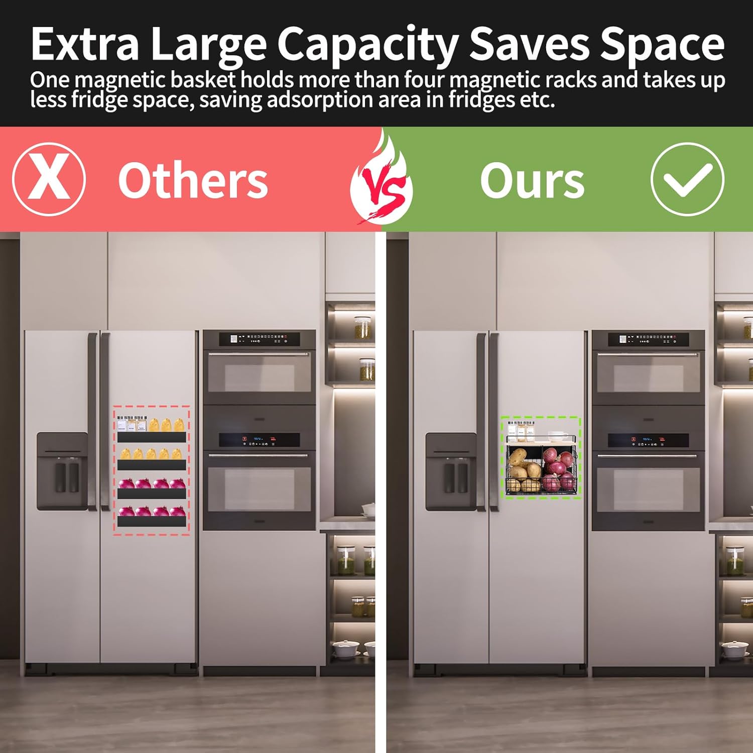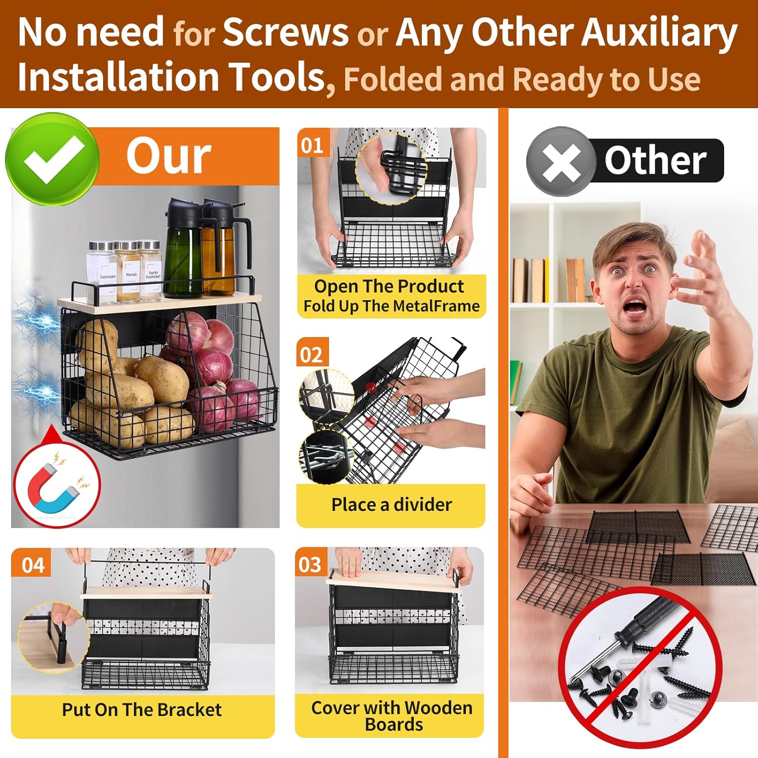 - Magnetic Design : The magnetic adsorption function allows the shelf to be used on metal surfaces like refrigerators, washing machines and other metal surfaces without any other additional support, it helps you to organize spice jars, small snacks, onions, potatoes, fruits, vegetables, cutlery and other kitchen accessories.