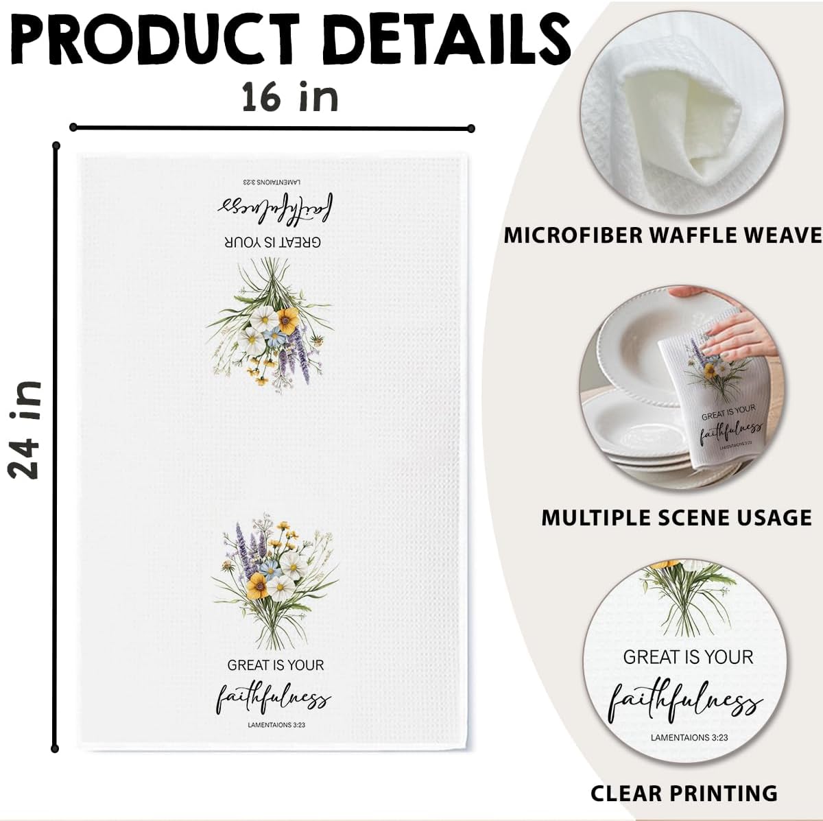 - Inspirational Fabric: Made of waffle weave microfiber and sized at 16x24 inches—soft, absorbent, and ideal for kitchen or bathroom spaces.
