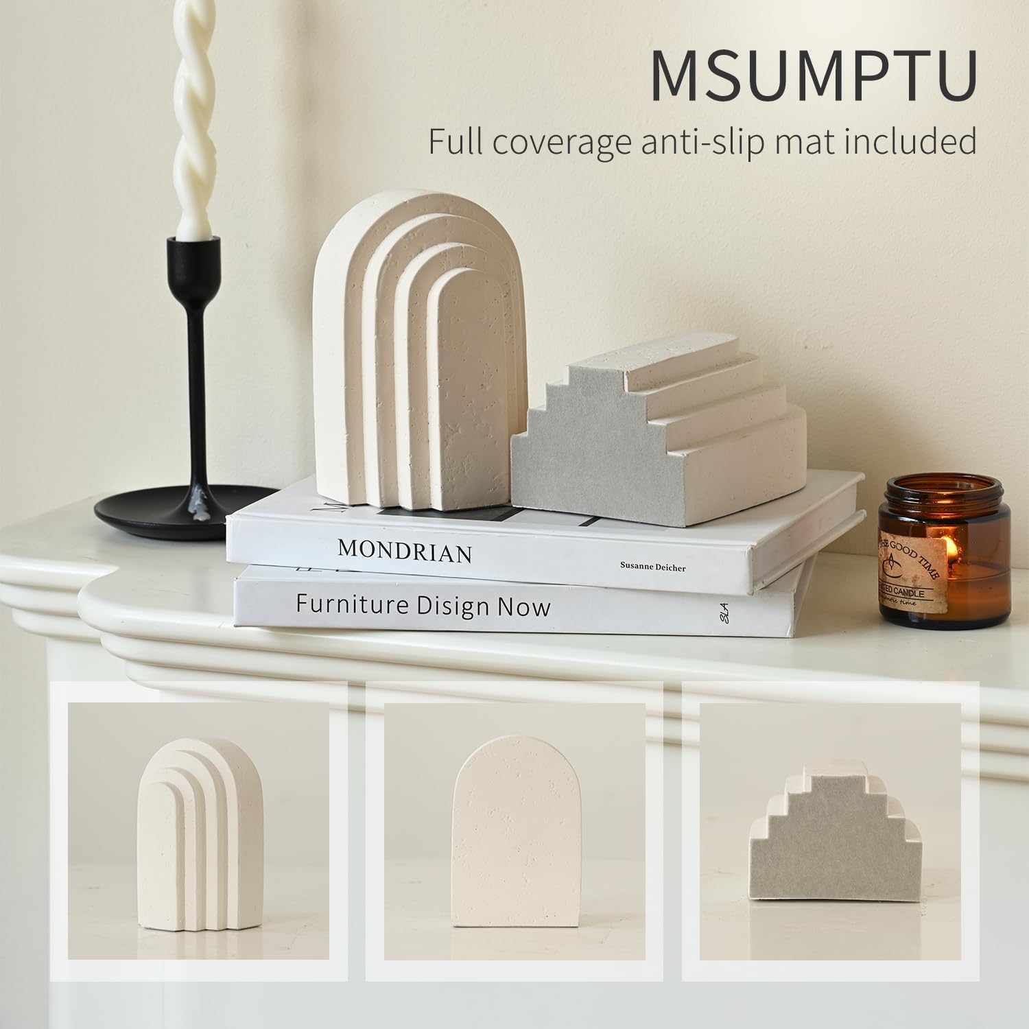 Decorative Bookends for Shelves, Set of 2 Book Ends for Heavy Books, Layered Arch Design Beige Bookend