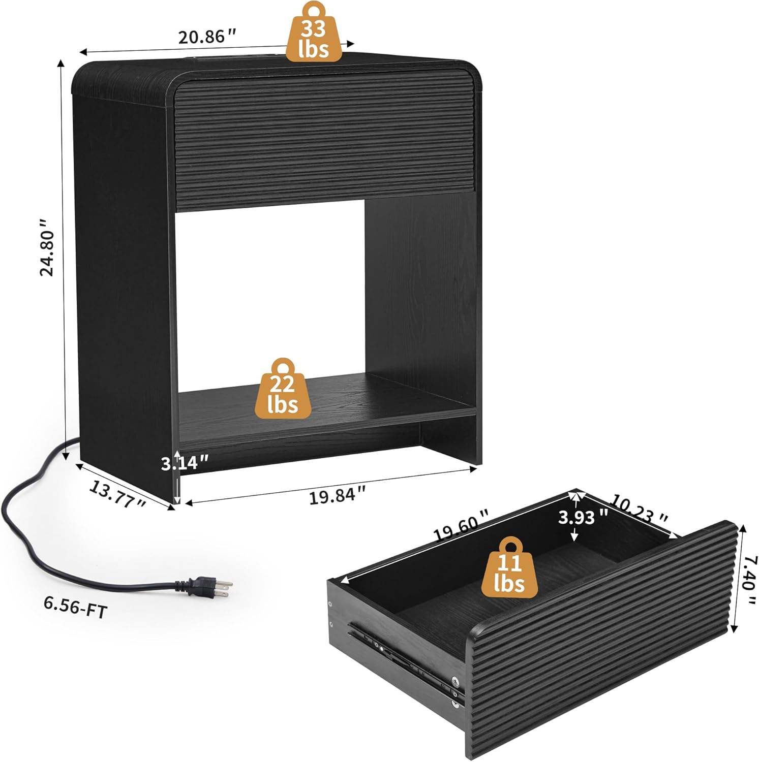 - 【Versatile Nightstand with Charging Station】Bedside Cabinet with 2 AC outlets & 2 USB ports conveniently located along the top, this nightstand has your charging needs covered. Measuring 20.86"W × 13.77"D × 24.8"H, our large nightstand provides ample storage space for all your bedside essentials. From books and reading glasses to electronic devices and personal items, everything can find its place within this spacious night stand. With its roomy desktop, large drawer, and open compartment, our bedside table allows you to keep your belongings tidy and within reach.