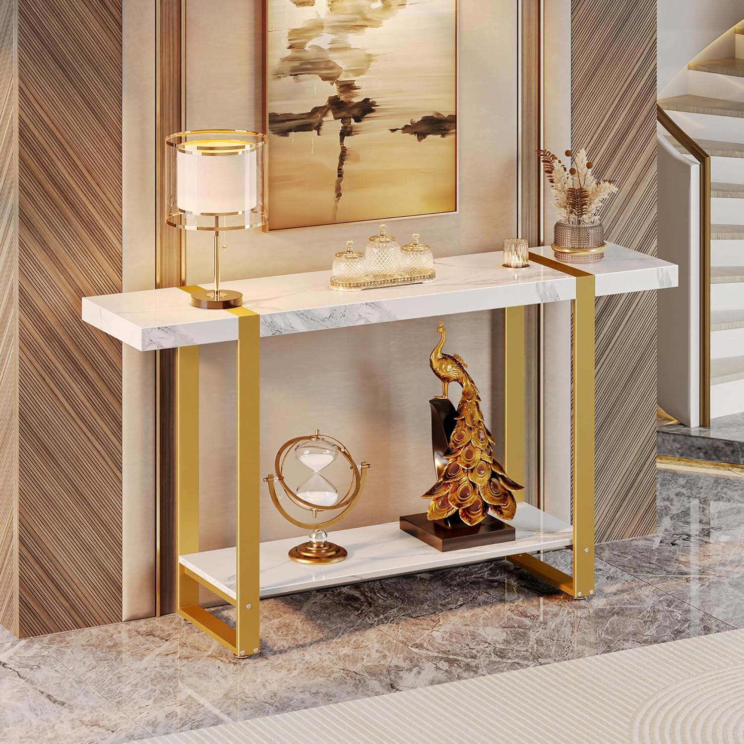 Huuger 47.2 Inch Entryway Table with Marble Top, 2-Tier Modern Console Sofa Table with Storage, Accent Table, for Entry, Hallway, Entrance, Foyer, T-Shaped Metal Frame, White Marble & Gold