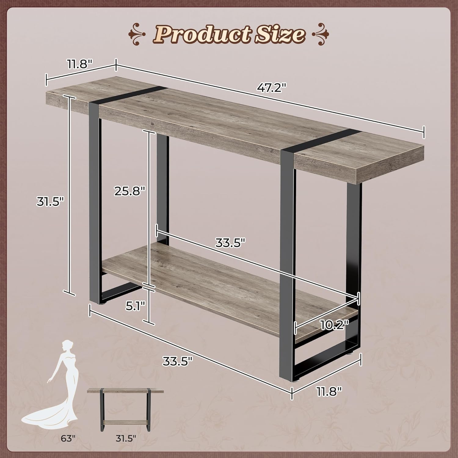 Huuger 47.2 Inch Entryway Table, 2-Tier Industrial Console Sofa Table with Storage, Accent Table, for Entry, Hallway, Entrance, Foyer, T-Shaped Metal Frame, Grey