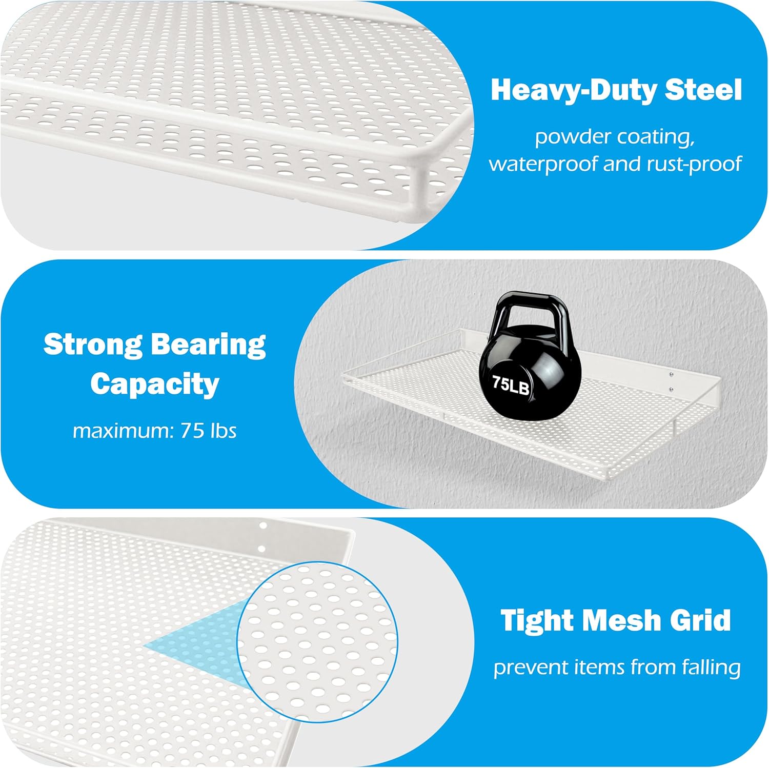 - Space Saving: The wall mounted shelves make full use of wall space to improve space utilization. Free up the floor area and bring order to a cluttered garage. The maximum load capacity can reach 75 lbs to fully meet the needs of daily use.