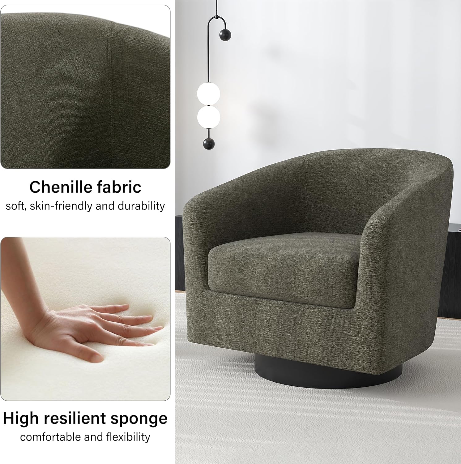 - 360 Degree Swivel Barrel Chair: This 360 degree round swivel chair designed for your leisure comfort. Heavy solid turntable, making it more stable and not wobbly