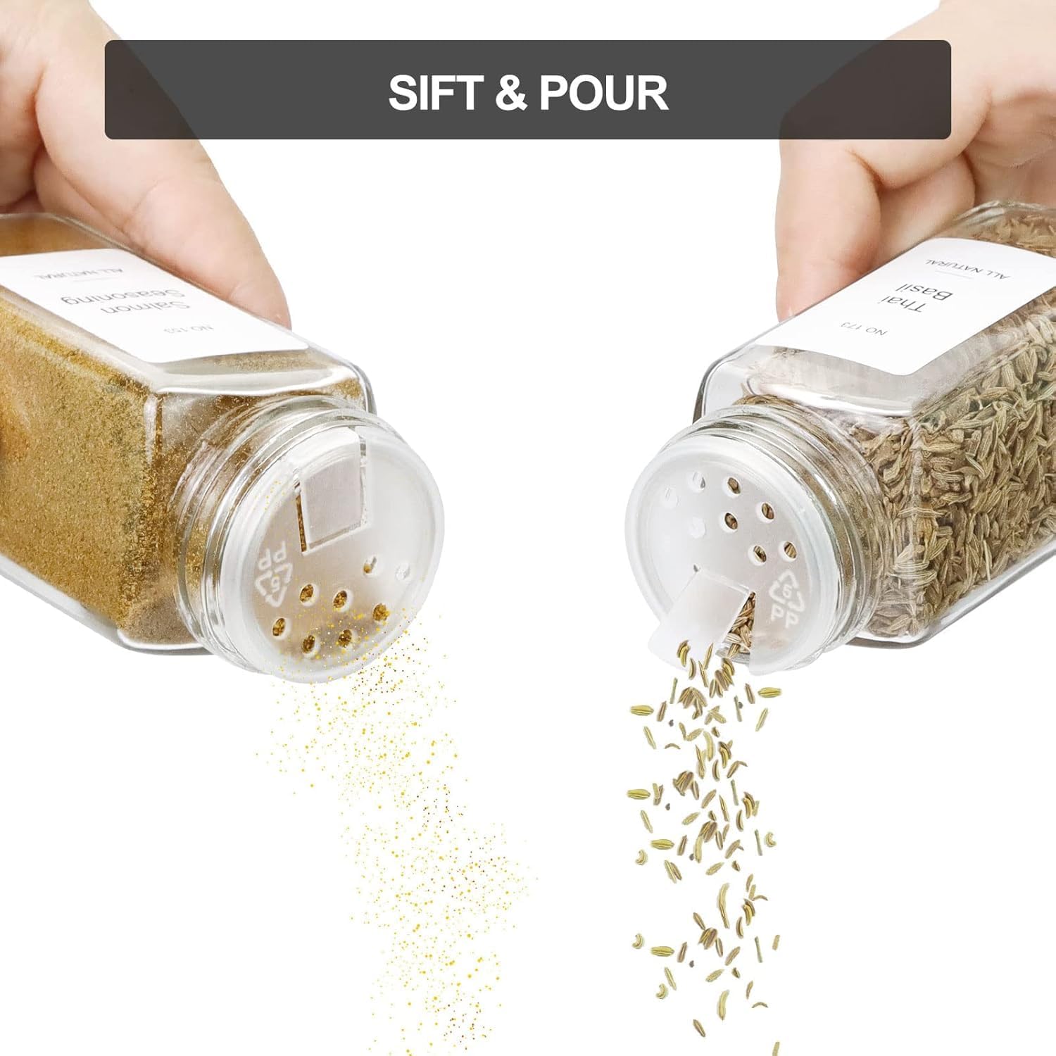 - 24 Glass Jars With Labels: Made of lead-free glass,capable of 4oz spices each; 2-in-1 shaker lid features sift and pour tops for light seasoning; 1 checklist,184 pre-printed spice labels and 32 blank labels for DIY, avoid hassle searching when labeling and cooking.