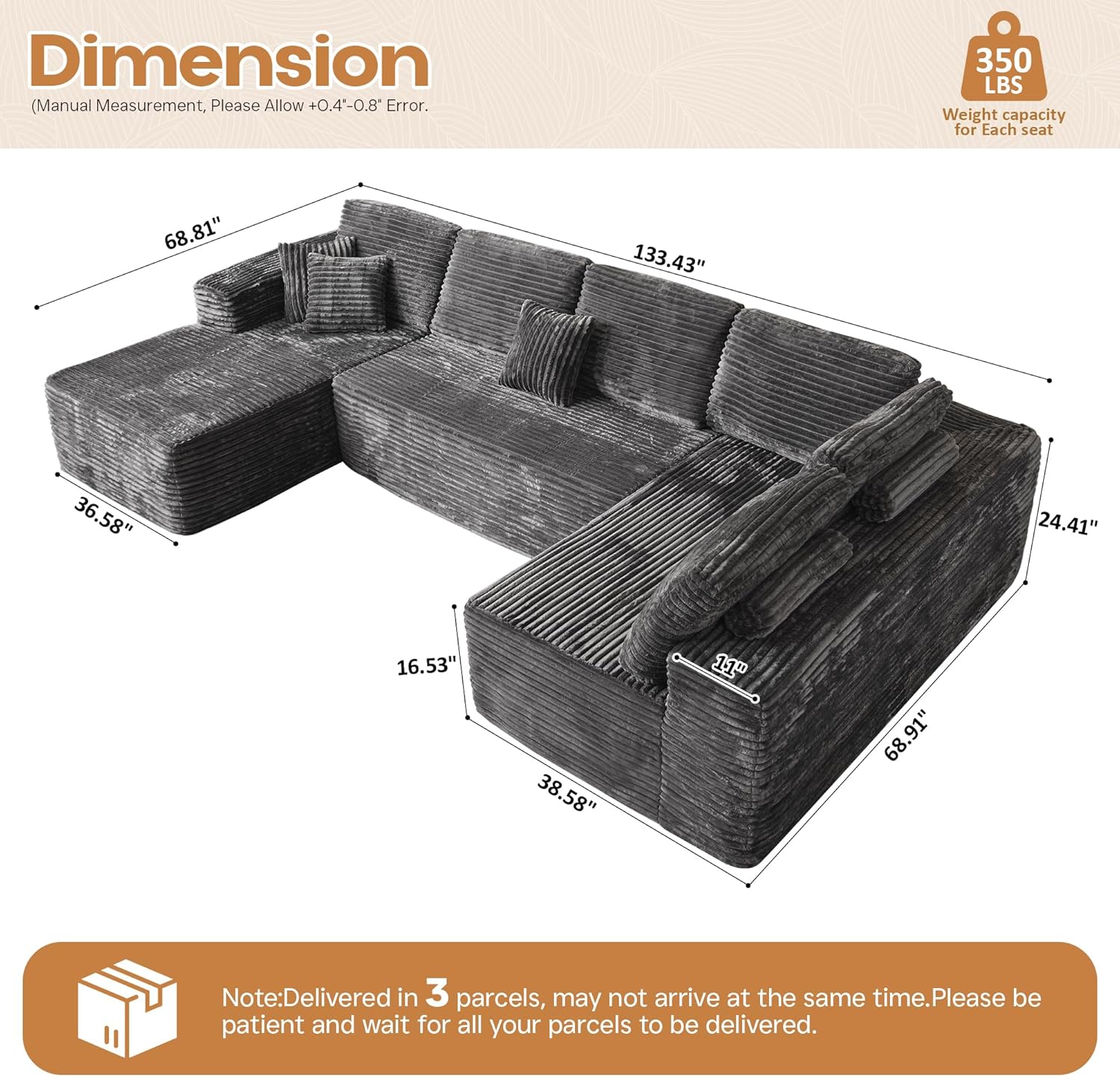Cloud Sectional Couches for Living Room,U Shaped Modular Sofas No Assembly,133x68 Inches Plush Corduroy Oversized Floor Couch Set with Deep Seat Chaise,Grey