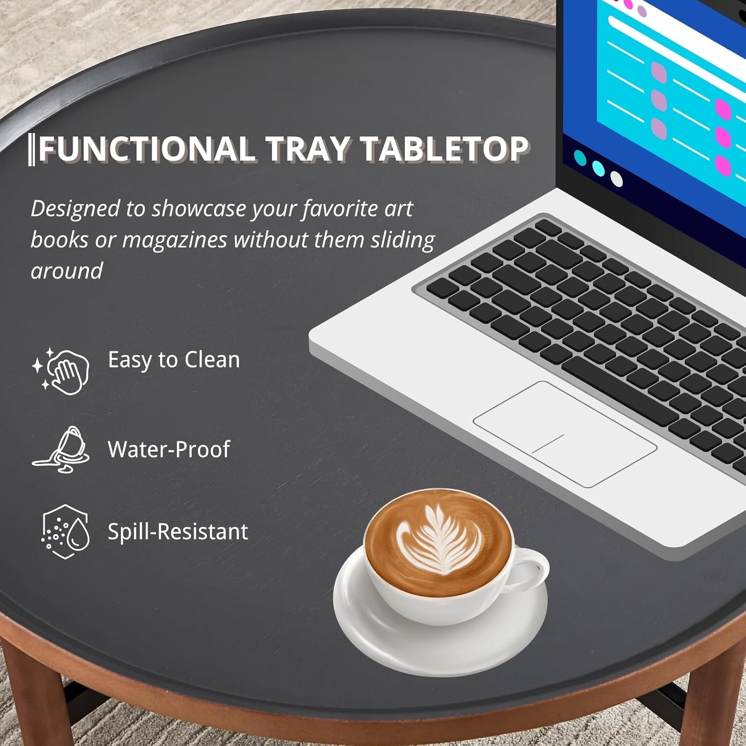 HEAH-YO Round Nesting Coffee Table Set of 2, Wood Tray Top Accent Table with Walnut Wrapped Metal Legs, Industrial & Farmhouse Side Table for Living Room/Office Reception, Black