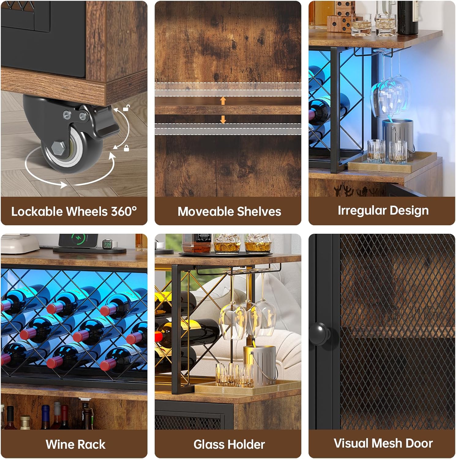Wine Bar Cabinet with Wheels, 4-Tier Bar Cart with Power Outlets and LED Light, Liquor Cabinet Home Mini Bar with Wine Rack, Coffee Bar Cabinet for Liquor, Rustic Brown