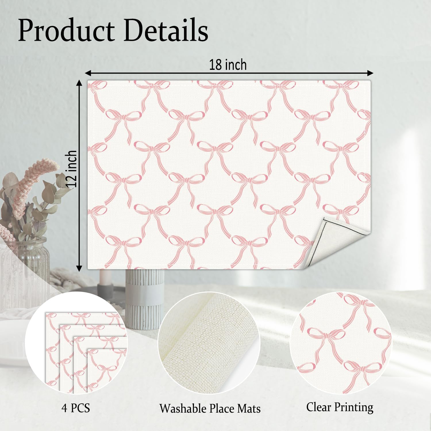 Placemats Set of 4, Pink Bow Table Mat for Home Kitchen, Restaurants, Outdoor Linen Washable Place Mats 12x18 inch Party Event Dining Decoration-06