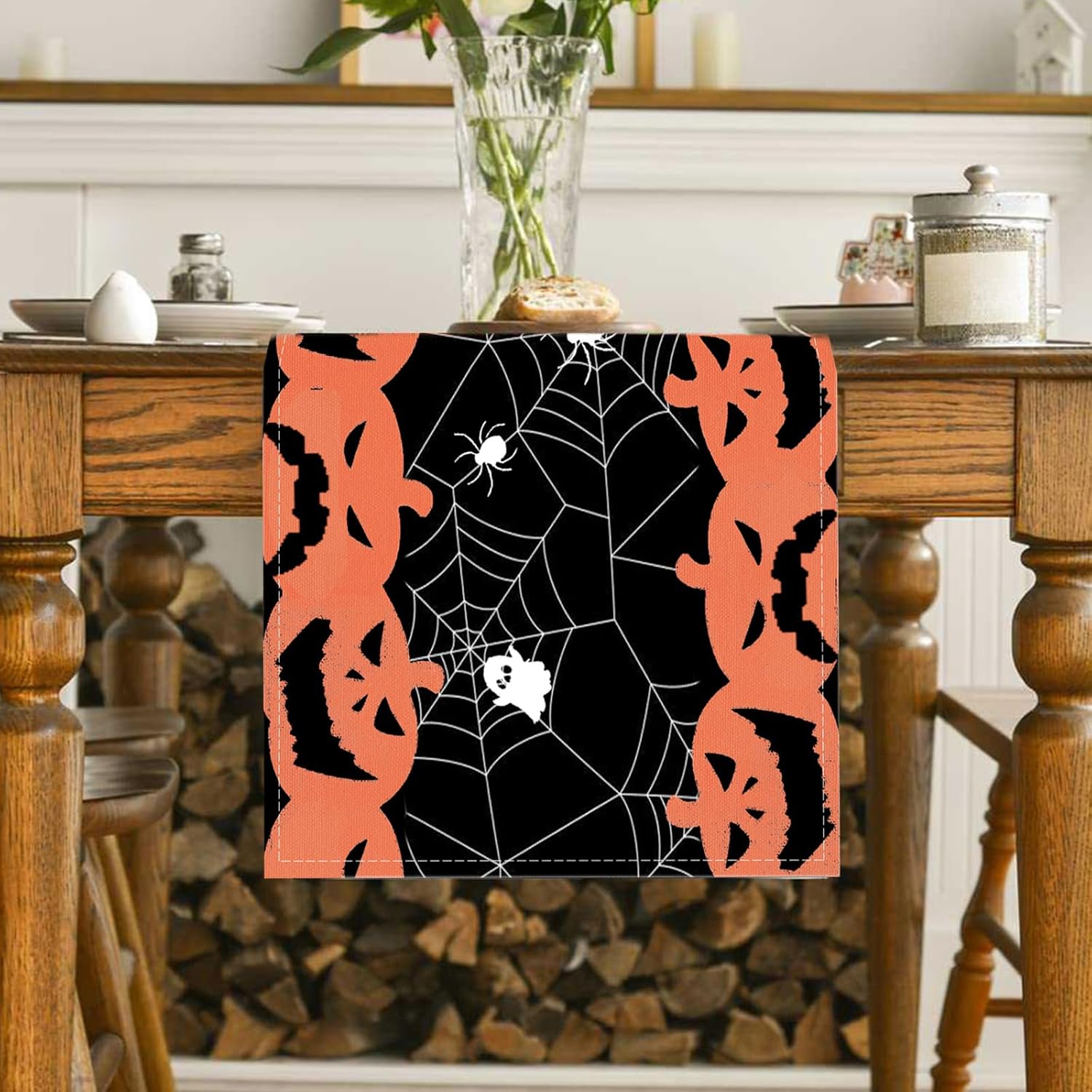 Halloween Table Runner Black and Orange Pumpkin Spider Web Table Linen Runner Halloween Decoration 13x36 Inch Table Runner for Dinning Kitchen Indoor Outdoor Halloween Kitchen Decor