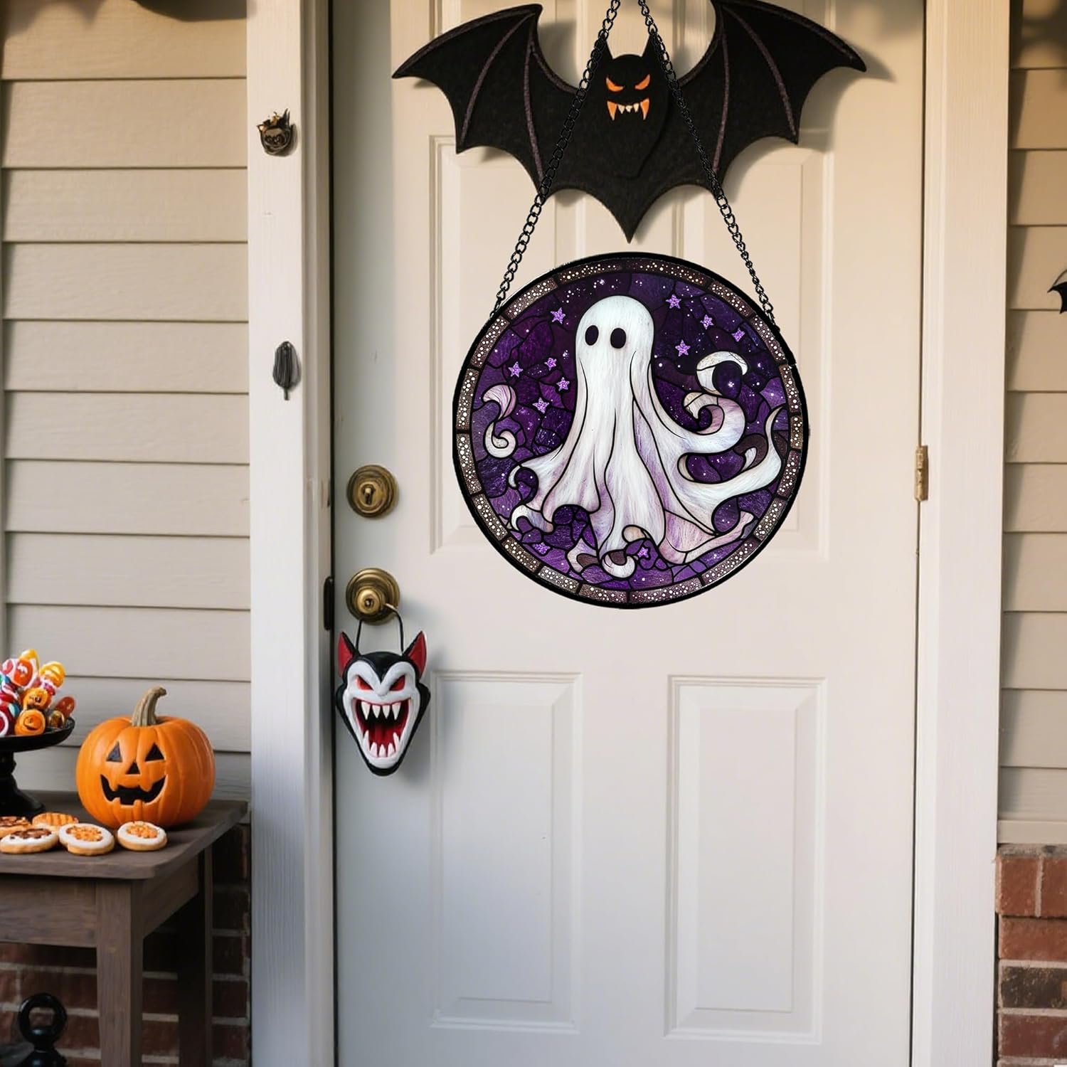 Stained Glass Window Hanging - Halloween Decorations White Ghost Purple Stars Suncatcher for Doors Garden Spooky Funny Sun Catchers Gothic Decor Horror Gifts for Women Men Friend 15 in