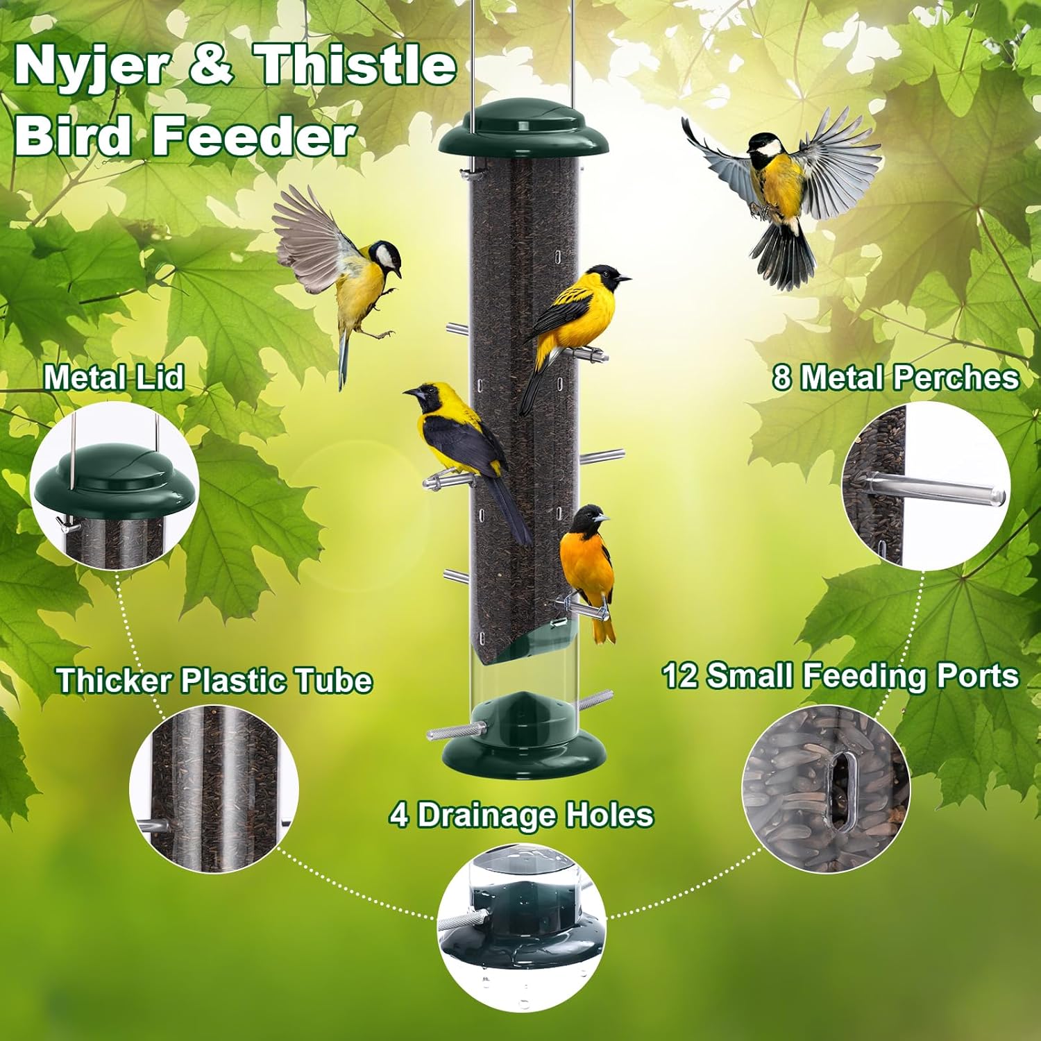 FEED GARDEN Finch Feeders for Outside, Nyjer & Thistle Bird Feeders, 15 Inch Tube Feeder with 12 Small Ports & 8 Perches, Durable Metal Design for Outdoor Hanging, Easy Fill & Clean