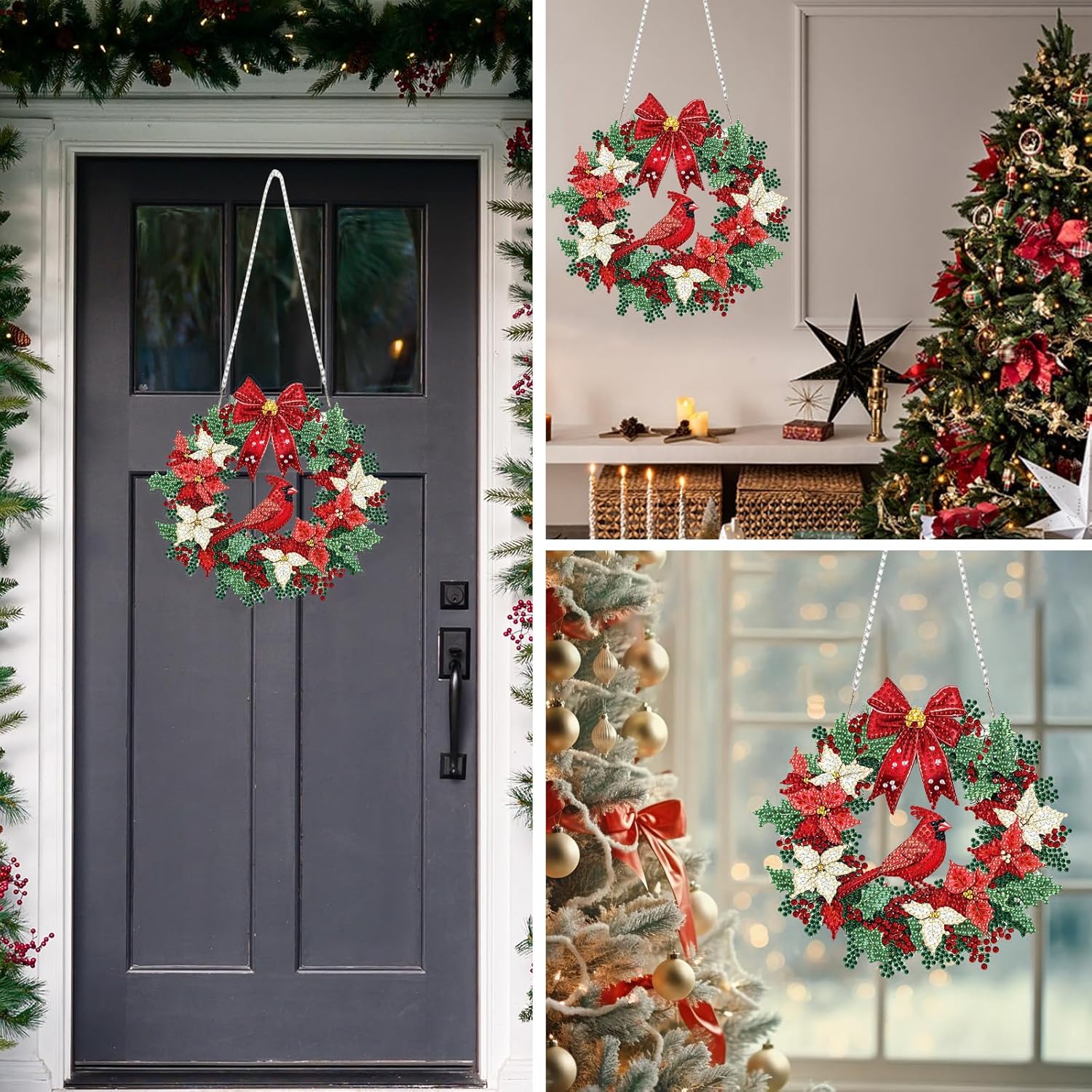 MEIYUDA Christmas Diamond Art Hanging Kits for Adult, Cardinal Wreath Diamond Painting Hanging Kits Ornaments, DIY Special Shaped Rhinestone Window Pendants kit for Home Garden Wall Decor Gift