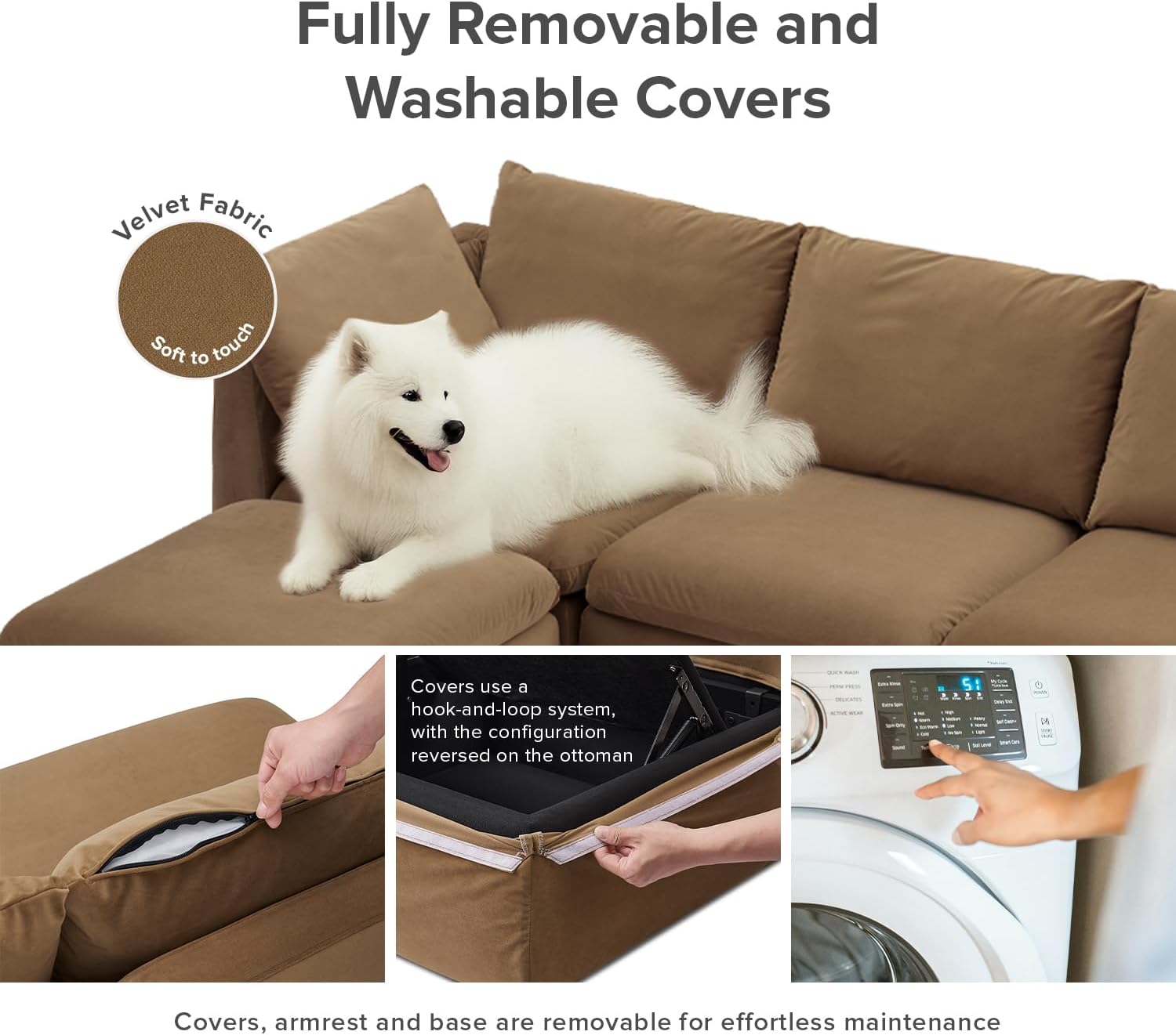 mopio Oversized Modular Sectional Sofa with Fully Removable Covers and Storage, Convertible U, L-Shaped and Sleeper Sectional, Modern Couches with Ottoman Chaise (Hazelnut Velvet, 4 Seats, L)