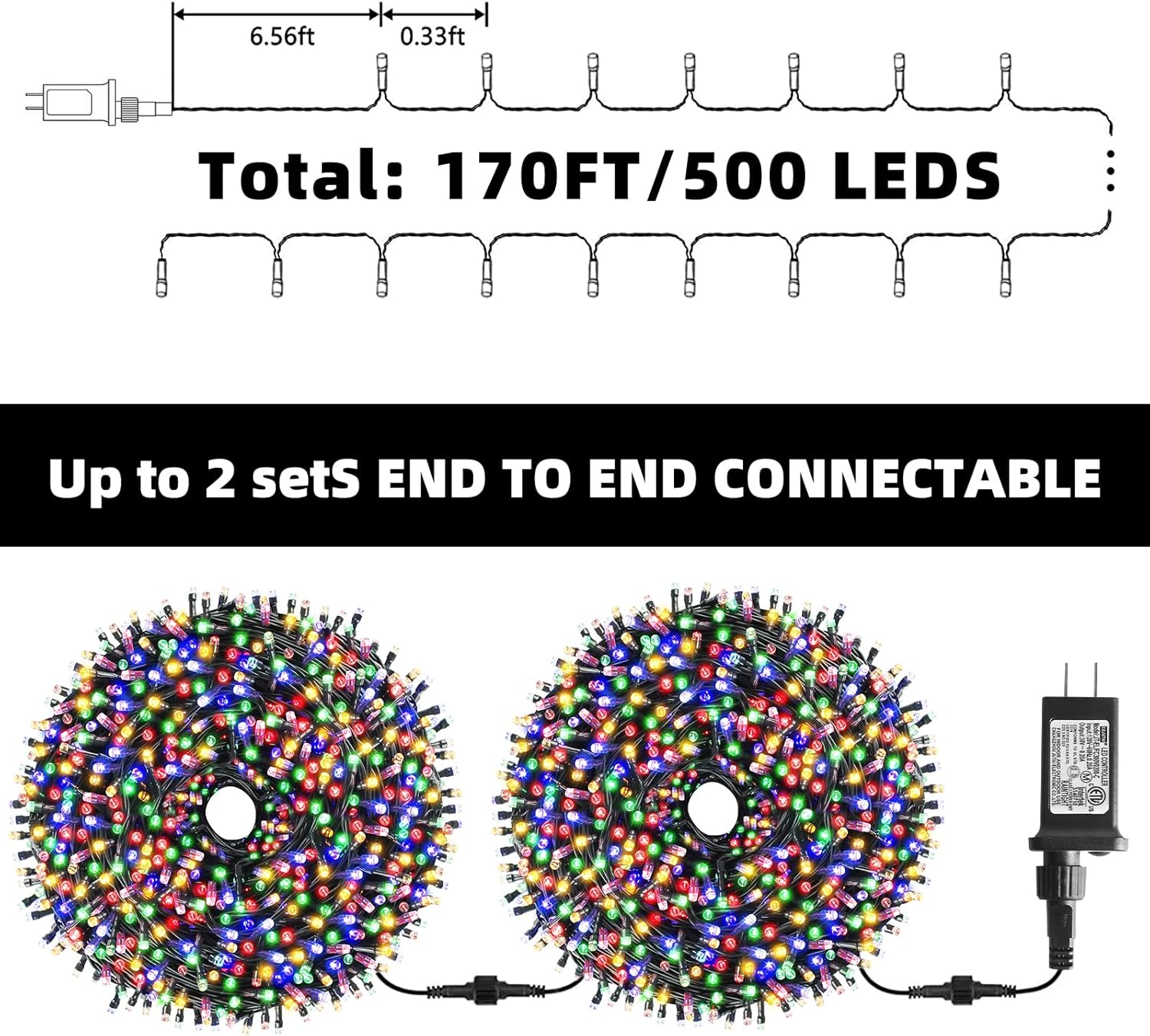XTF2015 Christmas String Lights 170FT 500 LED, End-to-End Plug 8 Modes Memory Function with Timer - UL Certified - Outdoor Indoor Fairy Christmas Lights for Tree, Patio, Garden, Holiday (Multicolor)