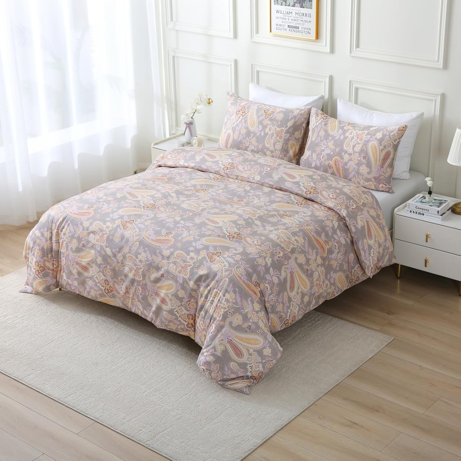 ABREEZE Paisley Bedding Sets 3Pcs Brushed Cotton Duvet Cover Set King Size Rustic Damask Gold Floral Comforter Cover with Zipper Closure Boho Bedding Collections