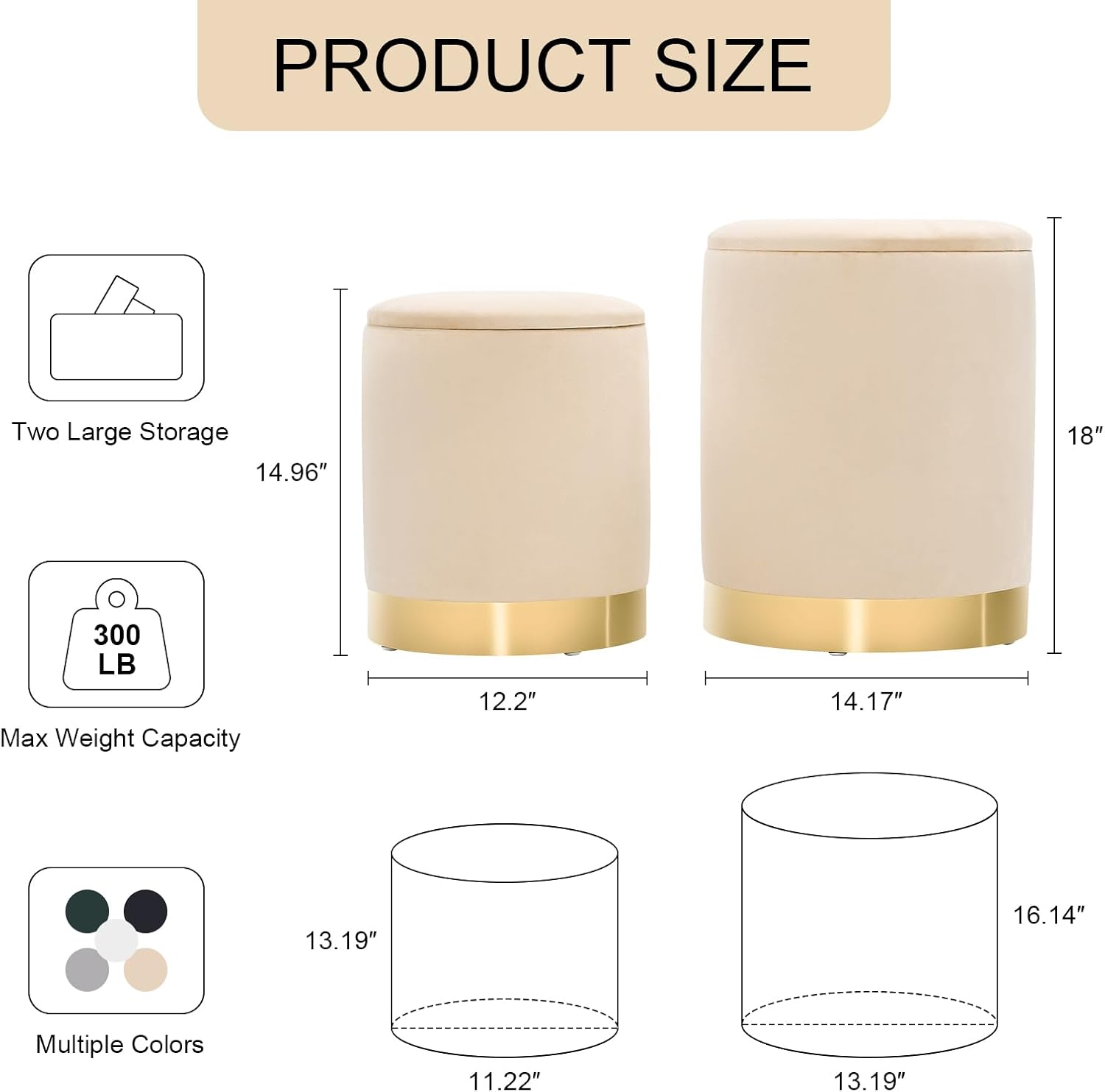Round Ottoman with Storage Set of 2, Upholstered Velvet Storage Ottomans, Vanity Stool, Multifunctional Ottomans, Coffee Table Foot Rest Ottoman for Living Room Bedroom, Khaki