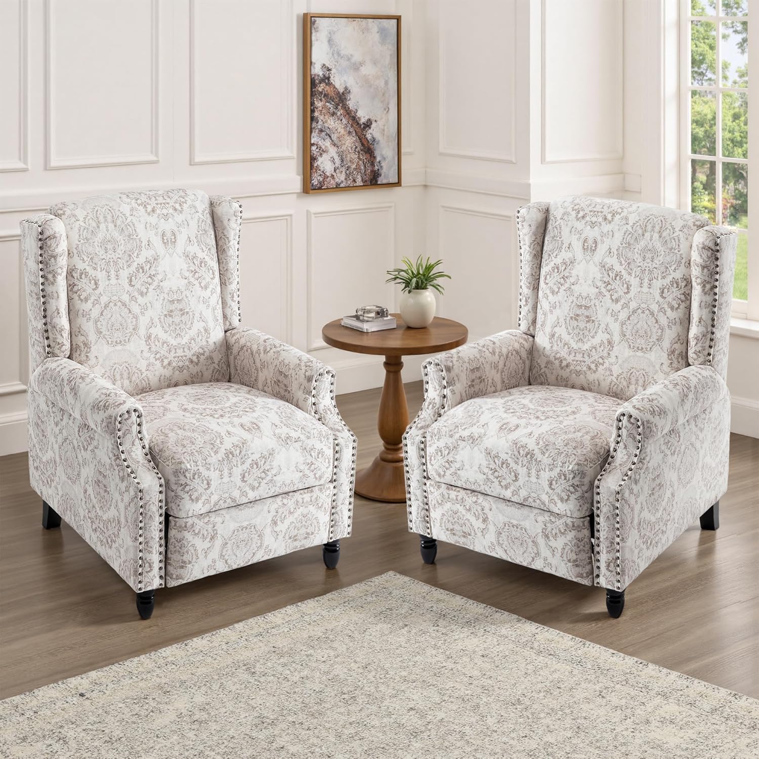 UIXE Recliner Chairs Set of 2, Fabric Upholstered Armchair Pushback Accent Chair for Living Room, Floral Rivet Trim Club Chair Home Theater Single Sofa Bedroom Side Reading Seat - Beige Pattern