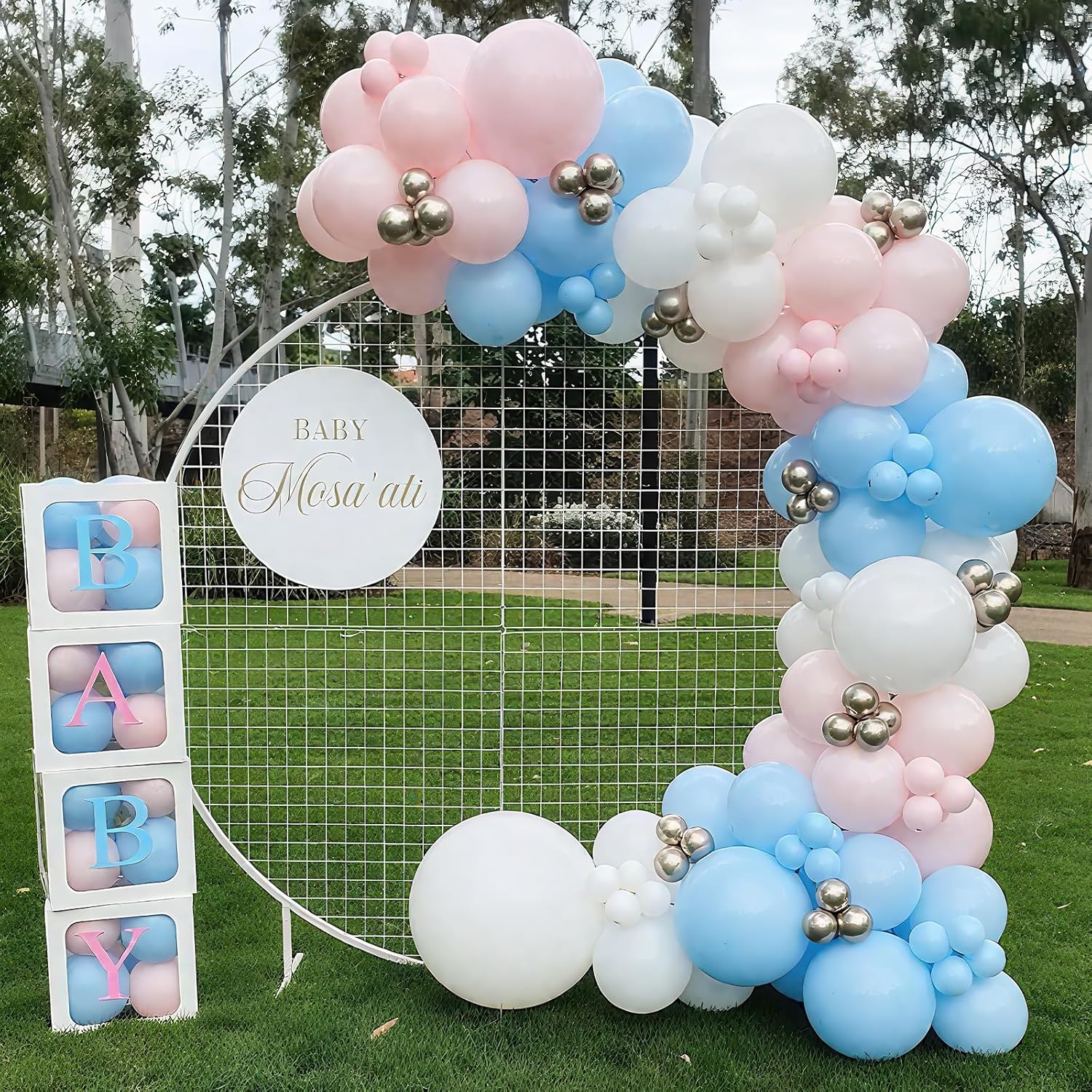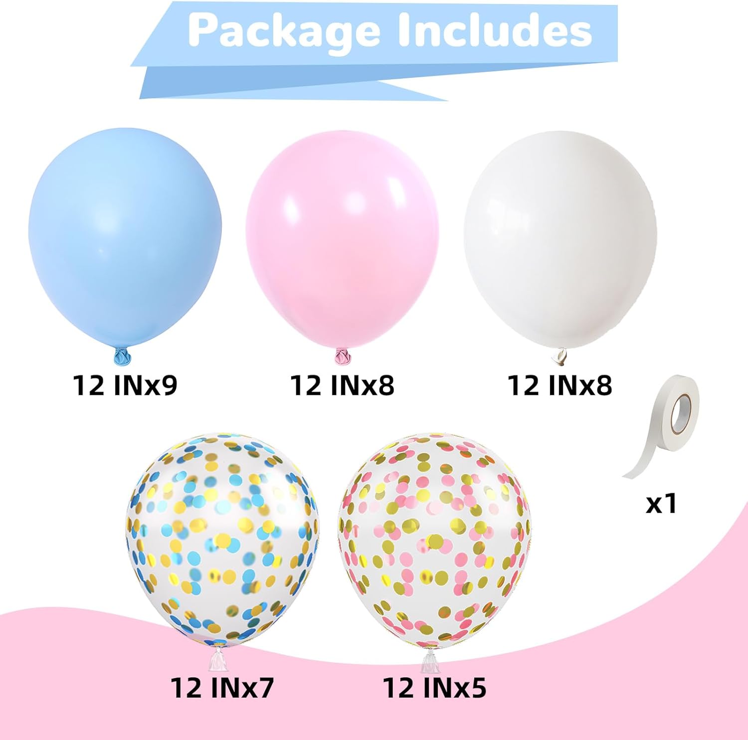- Pink and Blue Balloons: Includes 12 inch 35 pcs helium balloons with 8 pcs pastel pink balloons, 9 pcs light blue latex balloon, 8 pcs matte white balloon, 5 pcs pink gold confetti balloon, 5 pcs blue gold confetti balloons and a roll white ribbon