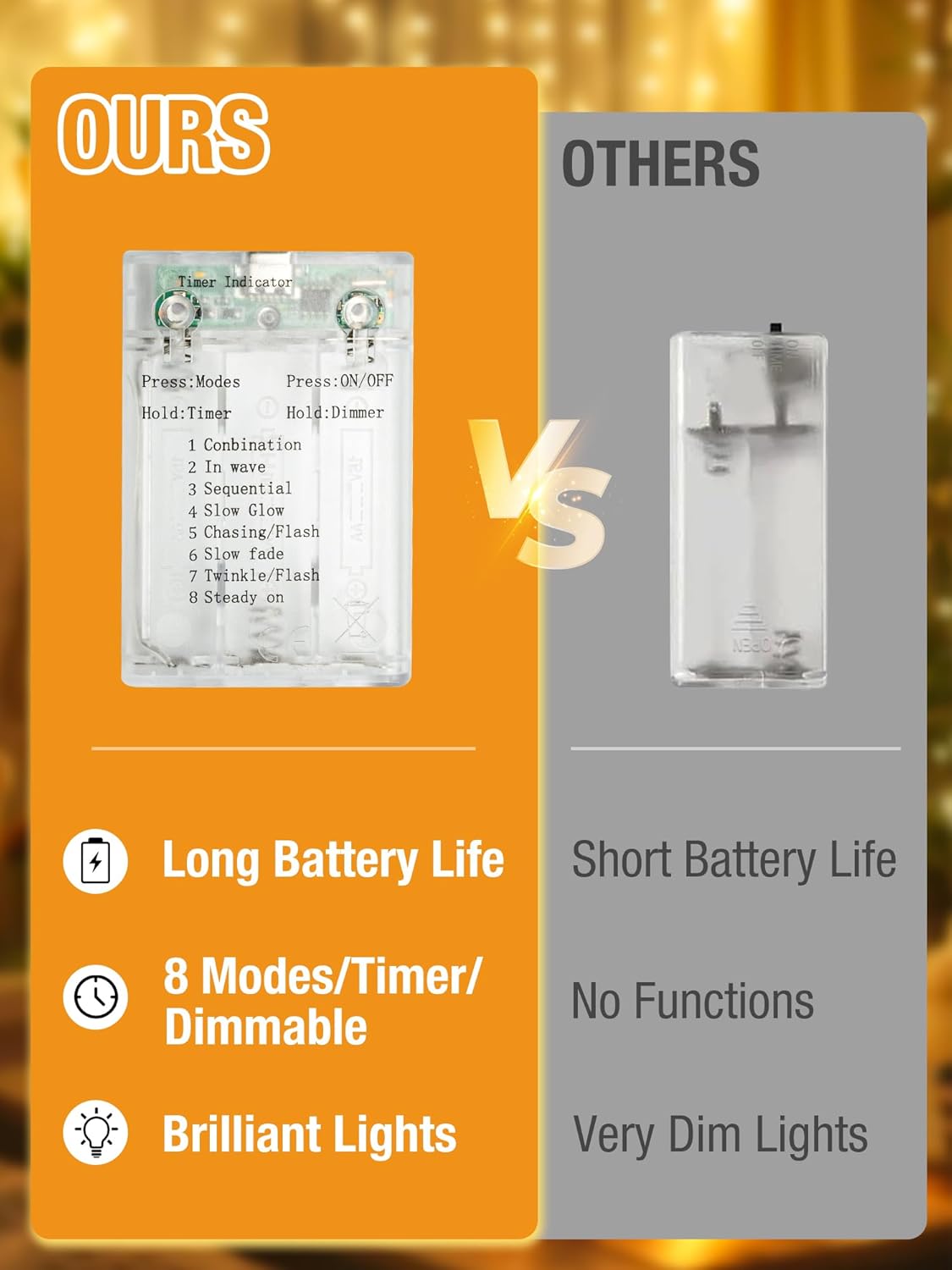 - Timer Function and Long Battery Life: The led fairy lights has a timer function. Press and hold the left button for 2 seconds until the ‘Timer’ indicator light turns on, and the lights will automatically steady on for 6 hours and then turn off for 18 hours. Fairy lights with timer helps save energy and extend battery life, with the light string capable of continuous illumination for up to one week