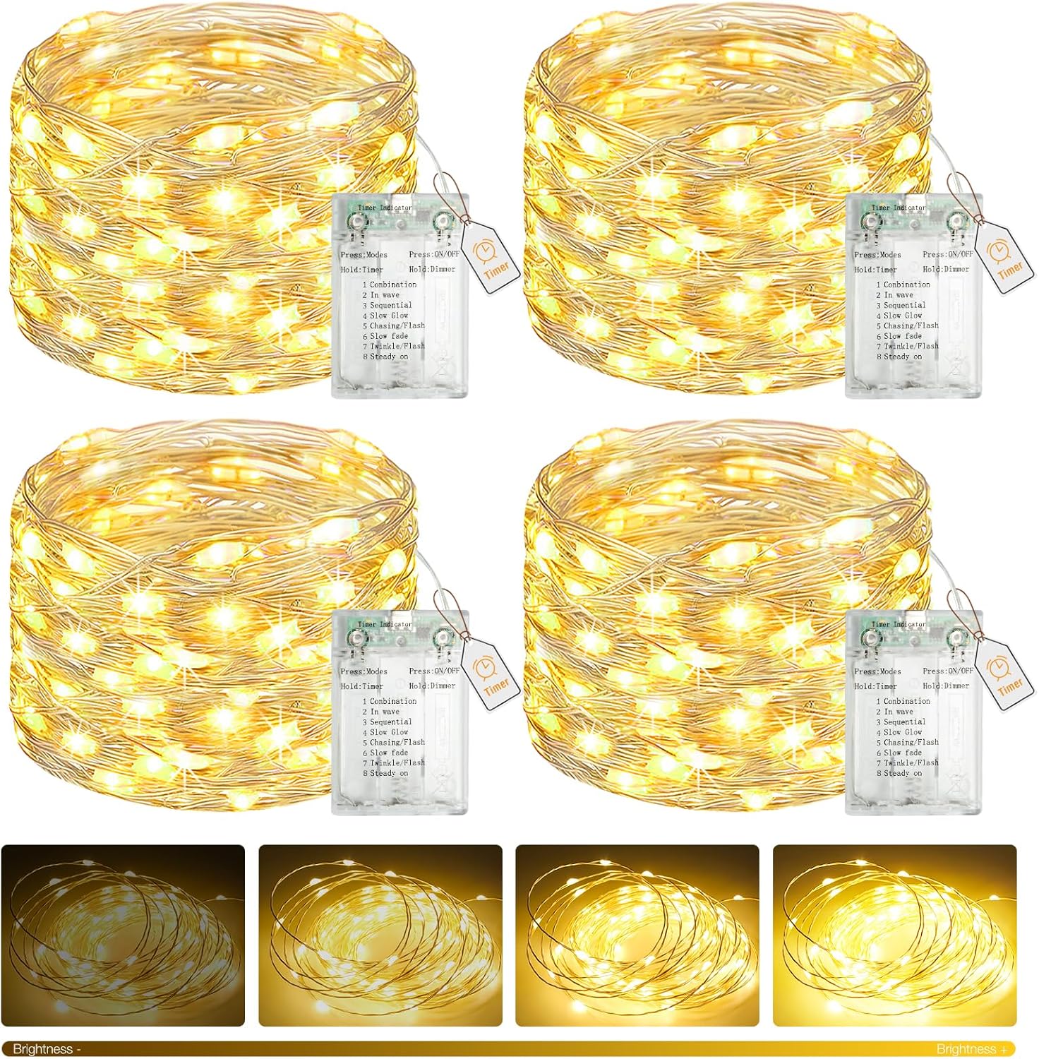 btfarm 4 Pack Fairy Lights Battery Operated with Timer, 16.4 FT 50 LED Twinkle String Lights 8 Modes Dimmable Waterproof Silver Wire for Indoor Bedroom Christmas Party Wedding Decorations, Warm White