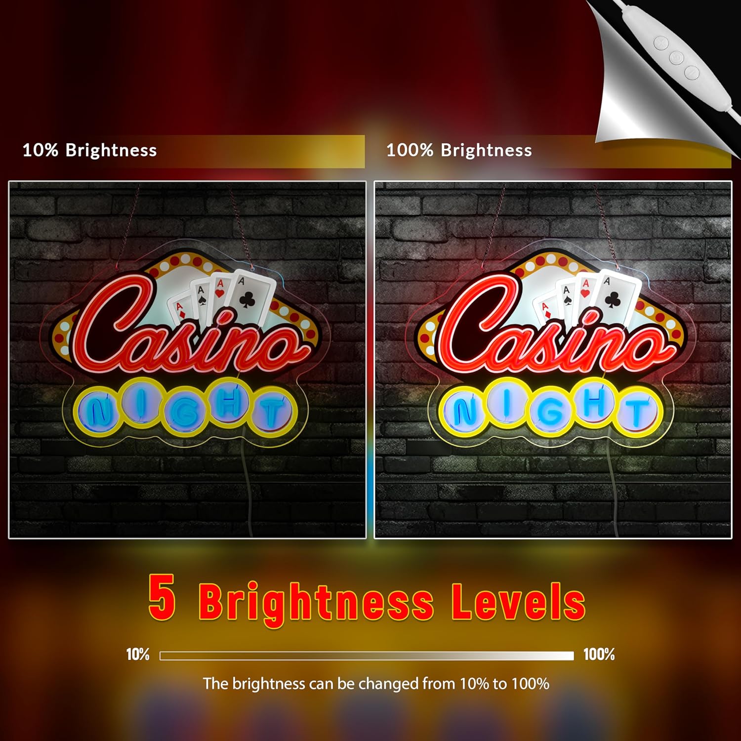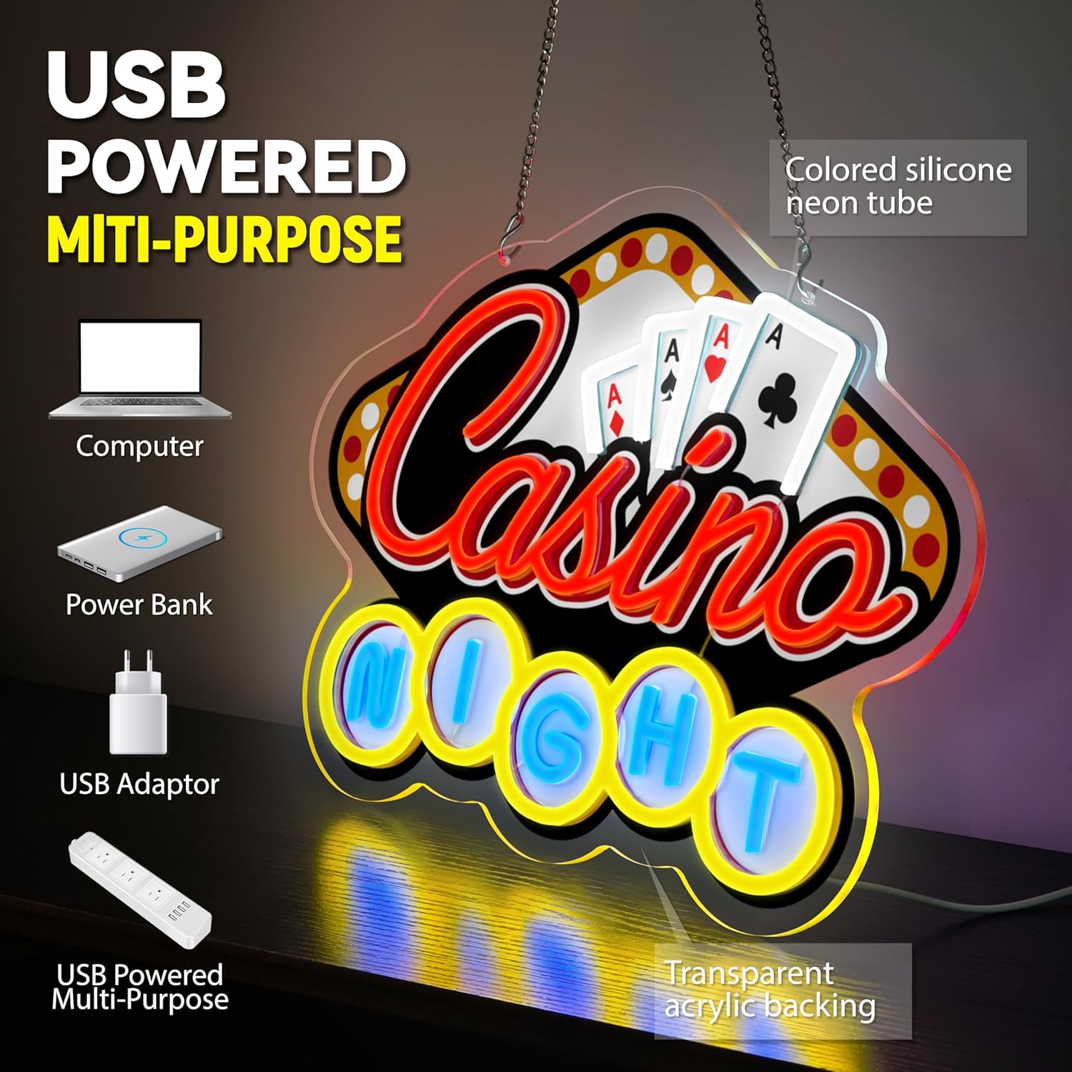 - Vibrant Casino-Themed Design: Bring Las Vegas vibes to your home! This neon sign features bold "Casino Night" lettering, four aces, and playful marquee-style Led sign—perfect for creating an energetic and entertaining atmosphere.