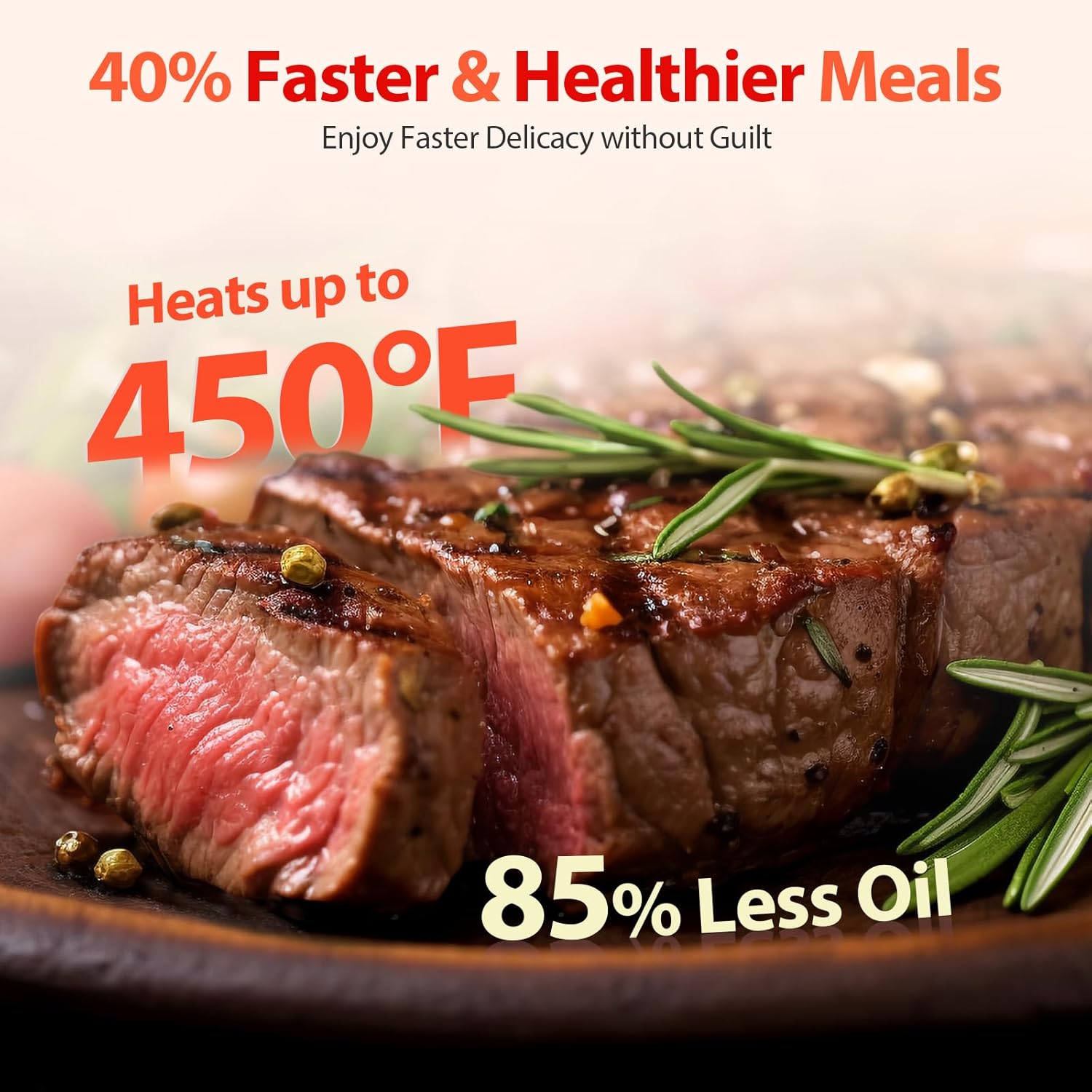- 【Healthier Meal in Minutes】With industry-leading temperatures up to 450°F and unique metal chamber design, this air fryer heats 40% faster than traditional oven, and up to 85%-90% less oil healthy results every time!