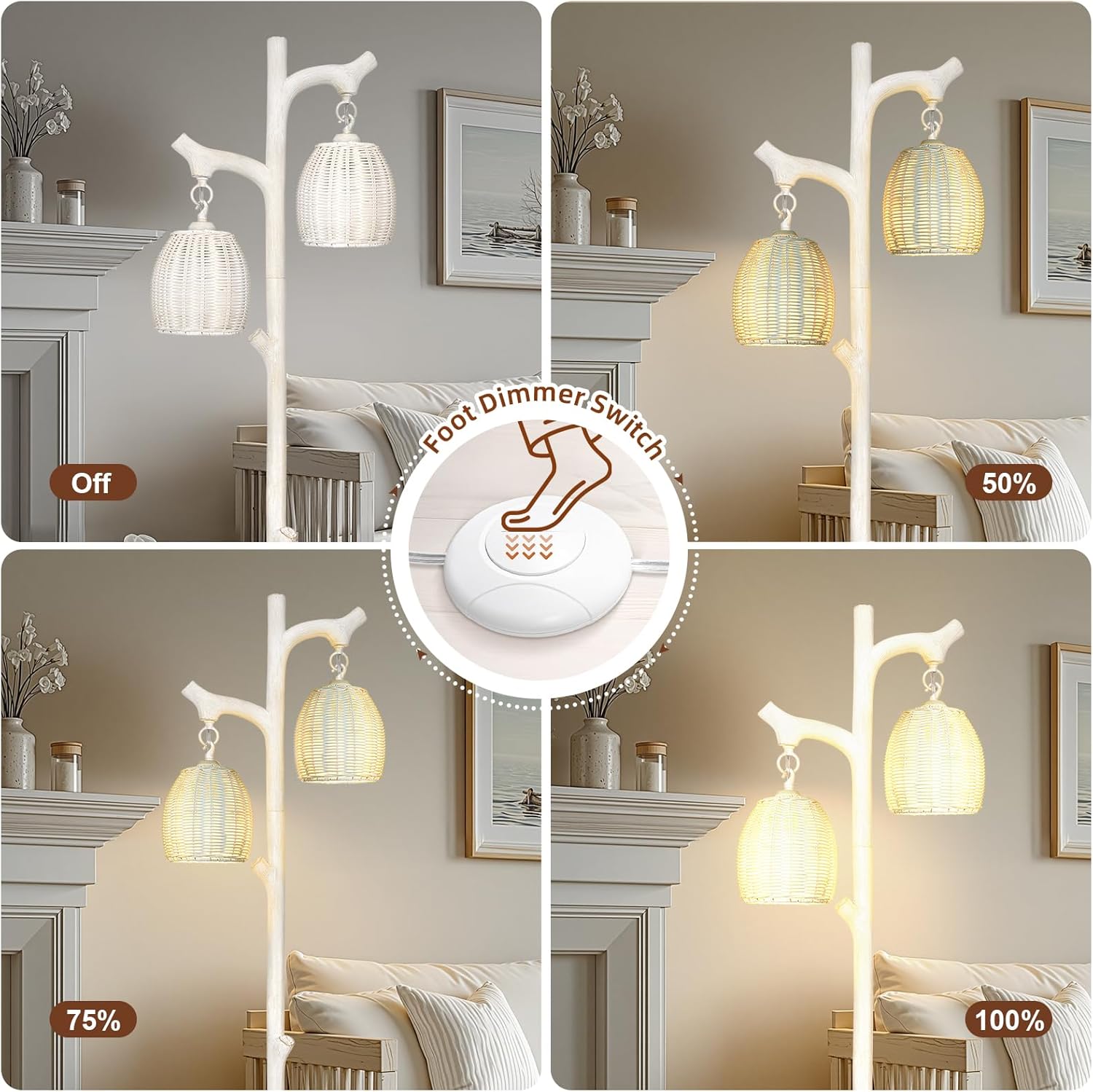 - FOOT SWITCH, DIMMABLE: Dimmable feature of foot switch corner floor lamp, 6.2ft plenty long enough cord, one click to control the ON or OFF switch, click more than 2 seconds that adjust the brightness from 0% to 100%, supper convenient. Dimmable floor lamp makes simple to create the perfect ambiance in any room