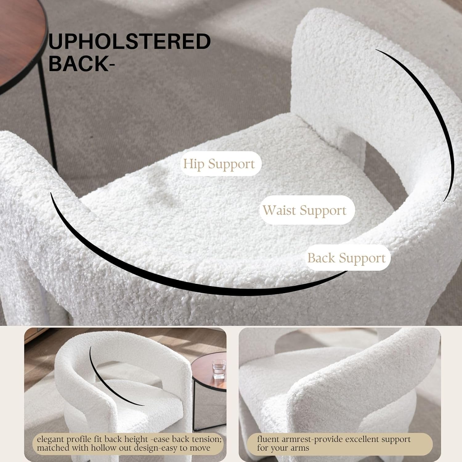 White Boucle Dining Chairs Set of 2, Modern Barrel Dining Room Chairs Upholstered Faux Fur Accent Chair with Arms and Round Back for Living Room Kitchen Armchair No Assembly Needed