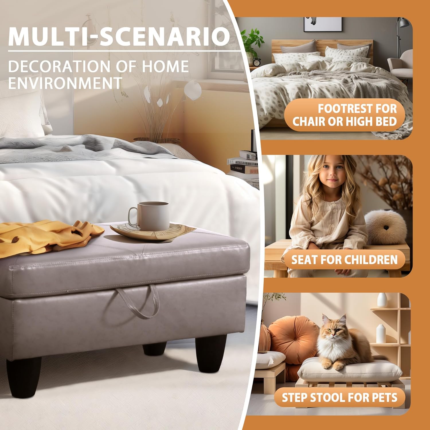 - PREMIUM MATERIALS: This storage ottoman features a thick foam cushion for added comfort. Built with a sturdy solid wood frame and durable plastic feet, it offers long-lasting quality while protecting your floors from scratches. The easy-to-clean faux leather surface gives it a sleek, modern look, and the smooth faux leather lid adds an extra layer of comfort for sitting. Perfect for any room, this ottoman combines style, durability, and functionality.