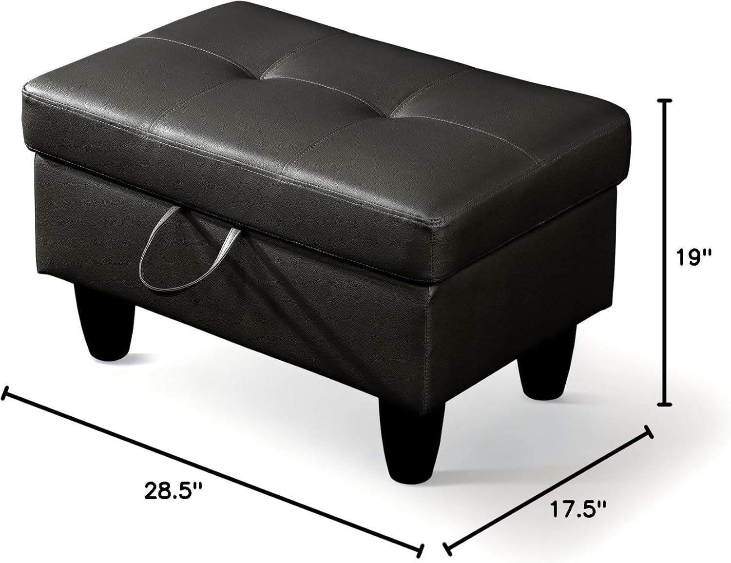 - DIMENSIONS: Measuring 28.5" L x 19" W x 17.5" H, this storage ottoman is perfectly sized to fit effortlessly into your space. With a weight capacity of up to 300 lbs, it offers both style and durability, serving as a sturdy seating option or reliable storage solution for your home.