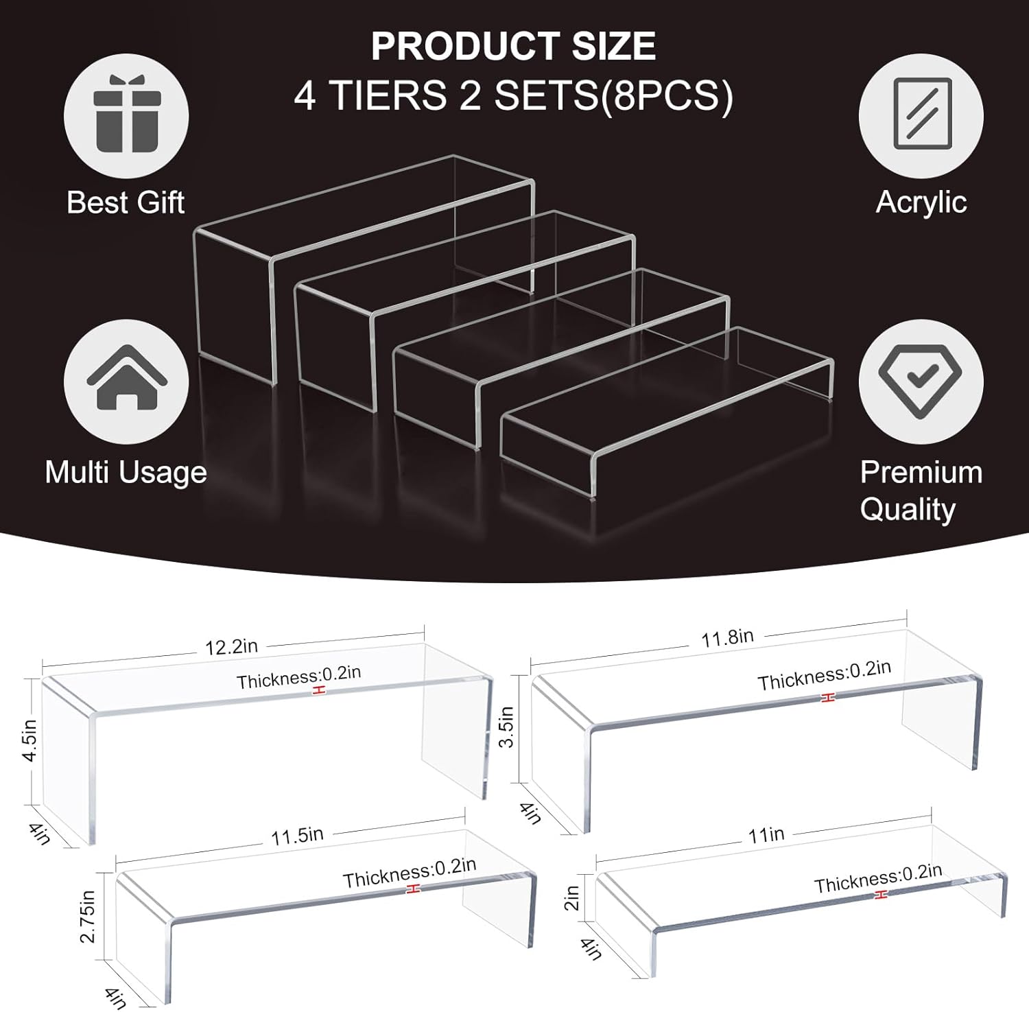- 【Package Contain】Blaithom acrylic display risers set Include 6 pcs of acrylic display risers. 2pcs of small size: 11"L×1.6"H×4"W,2pcs of middle size: 11.5"L×3"H×4"W, 2pcs of large size: 12"L×4.5"H×4"W. And the thickness of all display risers is 0.2in.