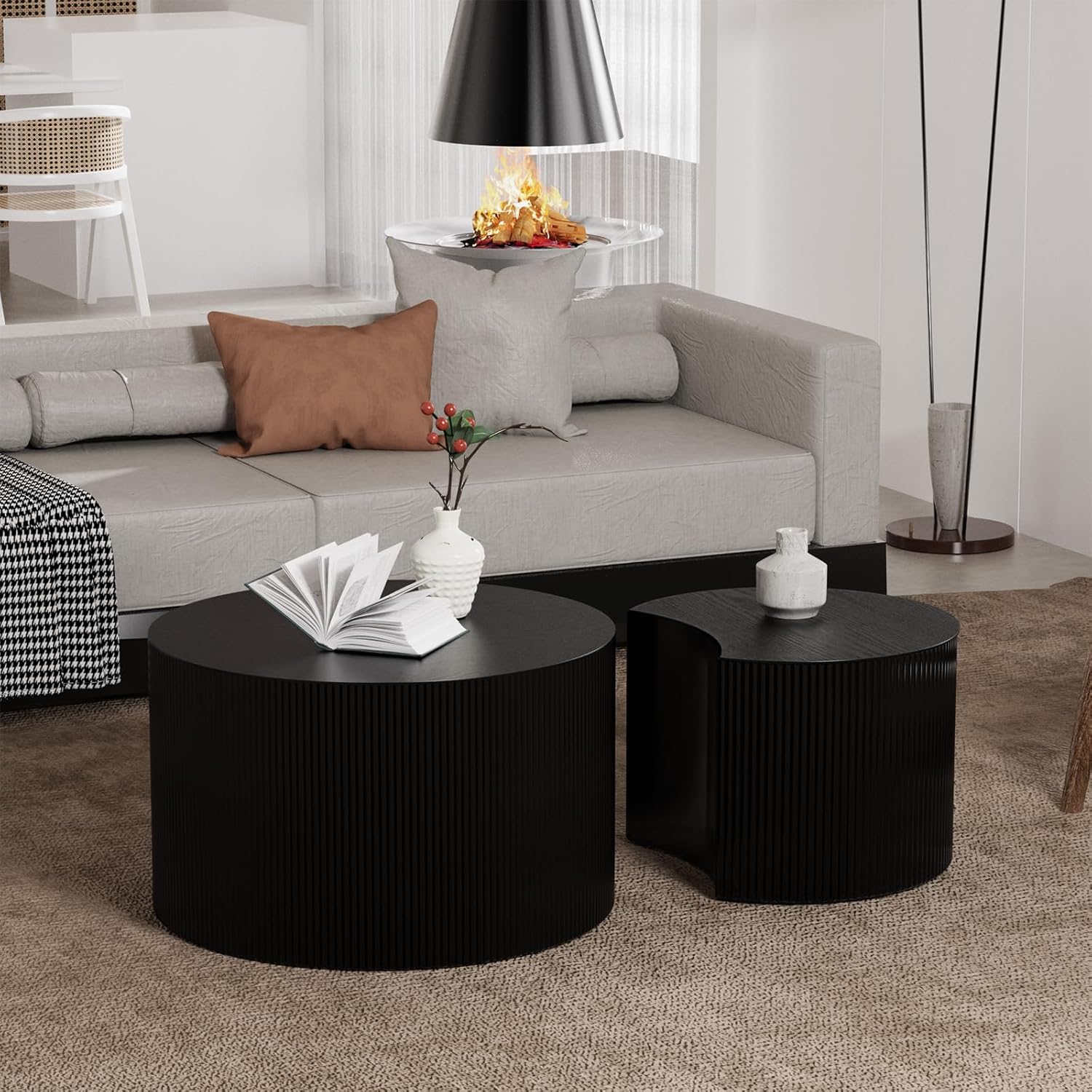 Round Nesting Coffee Table Set of 2 Handcraft Circle Fluted Nesting Coffee Tables Circular Side Table Drum Accent End Tables for Living Room Bedroom (Black Small)