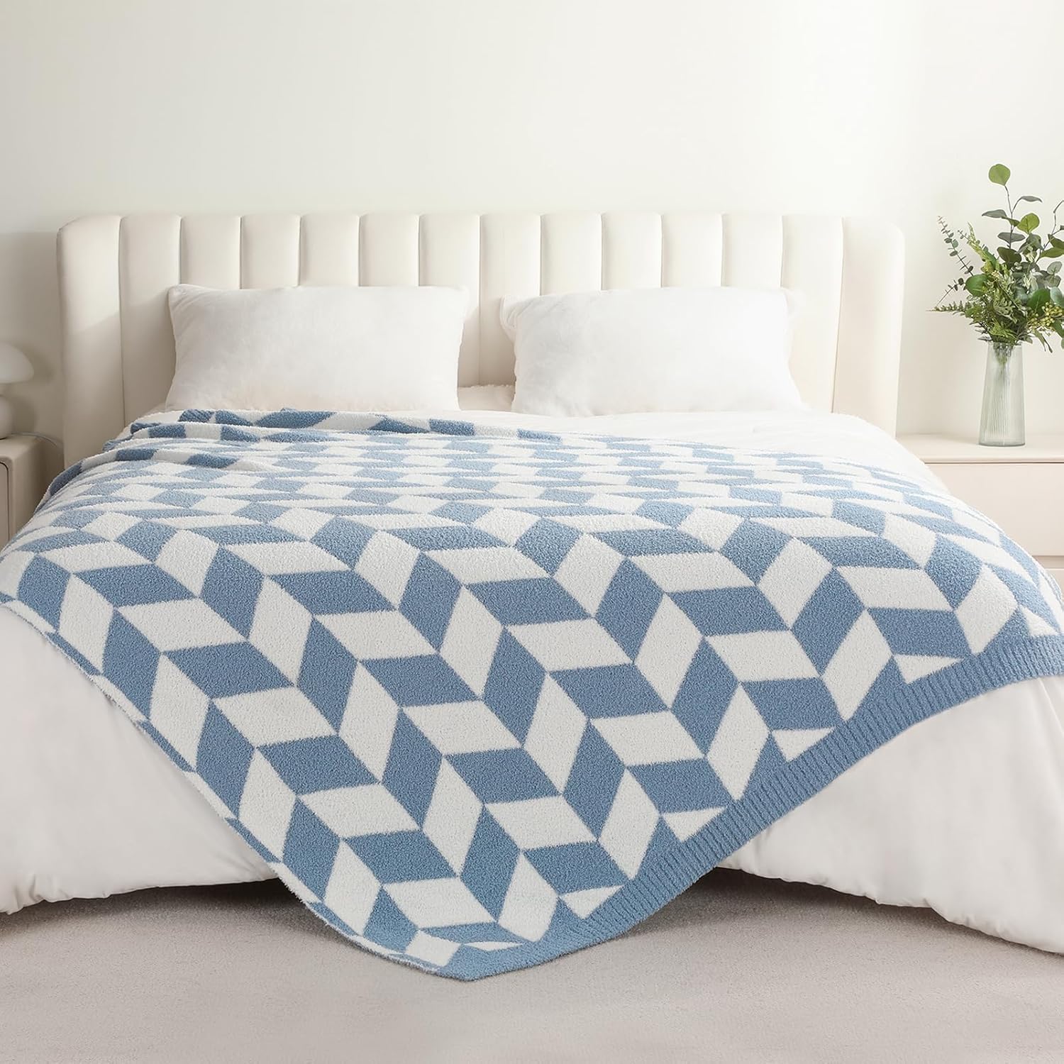 Snuggle Sac Twin Size Blue Blankets for Bed, Super Soft Warm Blankets Oversized Cozy Knit Fuzzy Blanket for Living Room, Chevron Blue,60x80 inches
