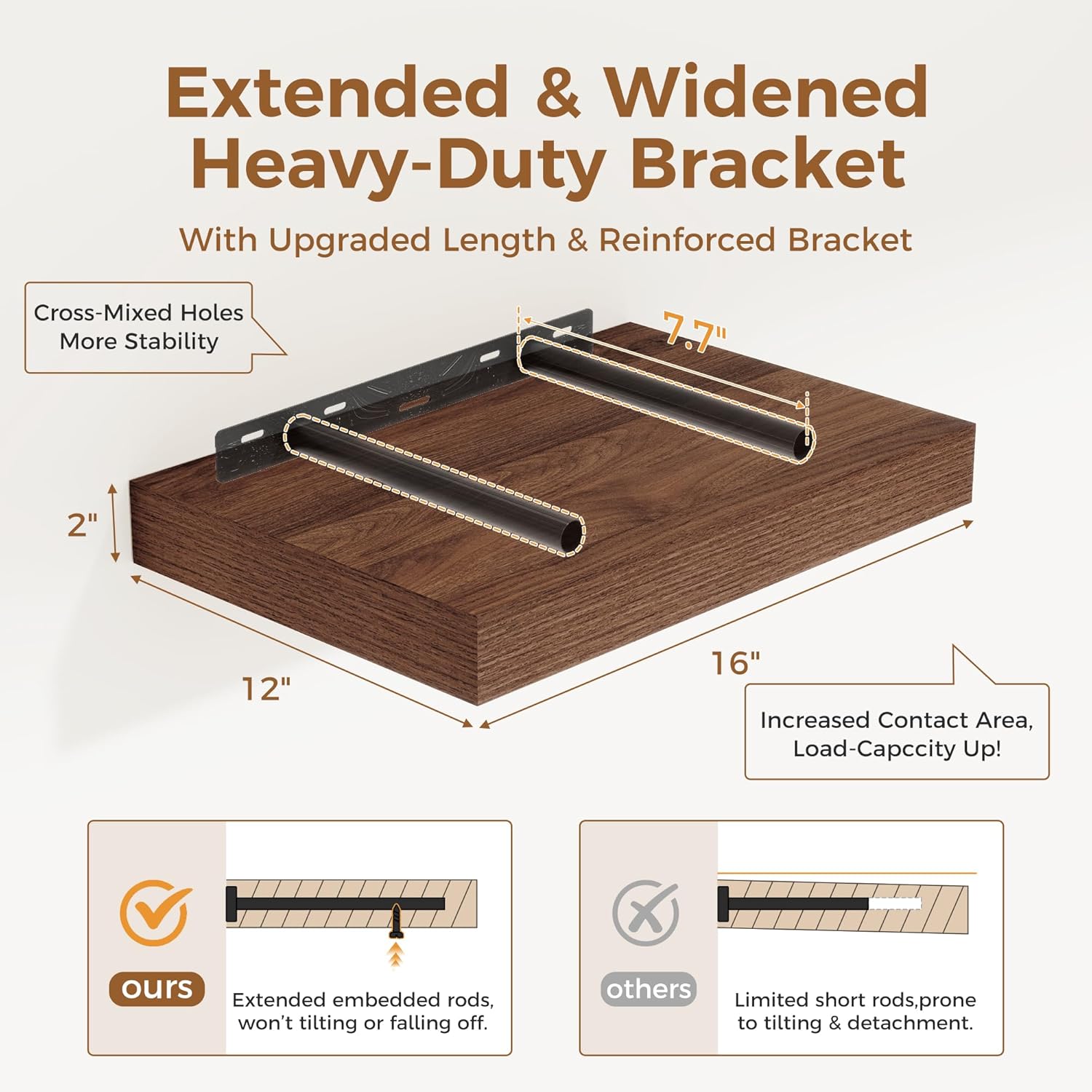 12 Inch Deep Floating Shelves, 16 x 12 Floating Shelf for Books, Rustic Wood Deep Wall Shelves for Home Storage & Display, 2" Thicked Shelves for Kitchen, Living Room, Bedroom, Walnut Color, 2 Pack