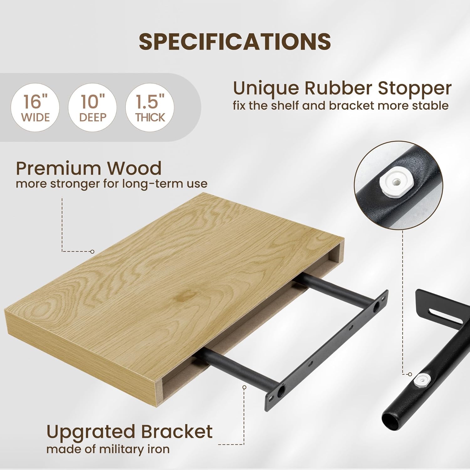 Fun Memories Floating Shelves for Wall - 10 x 16 Floating Shelf - Rustic Wood Storage Shelf - Wall Shelves with Invisible Bracket - 16" Bookshelves for Living Room & Bedroom - Oak - Set of 2