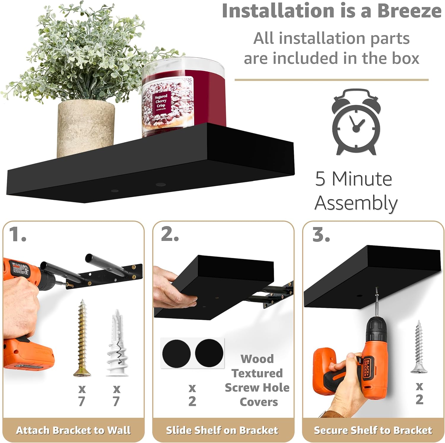 - Easy Installation: Mounting hardware INCLUDED the Hanging shelves are made of beautiful MDF with PVC + Bracket - Sturdy enough to arrange and display your favorite small objects - Attaches firmly to the wall without visible support - Minor assembly required - Supports up to 22 pounds per shelf - Measures approximately 16.25 inch L x 5.50 inch W - Each display shelf 1.5 inch thick