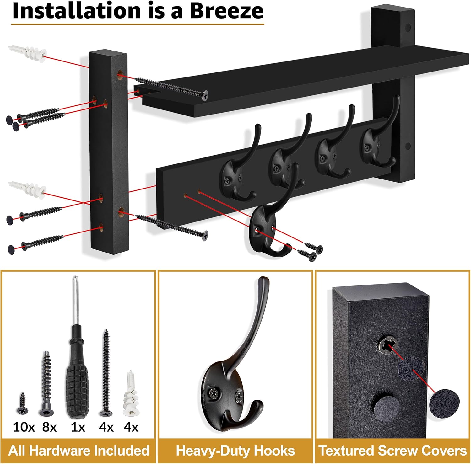 Sorbus Coat Hooks Wall Mount with Shelf – 16 Inch Coat Rack Wall Mount with 5 Heavy Duty Hooks – Floating Wall Shelf with Hooks for Entryway, Bathroom, Bedroom, Kitchen, or Mudroom (Black)