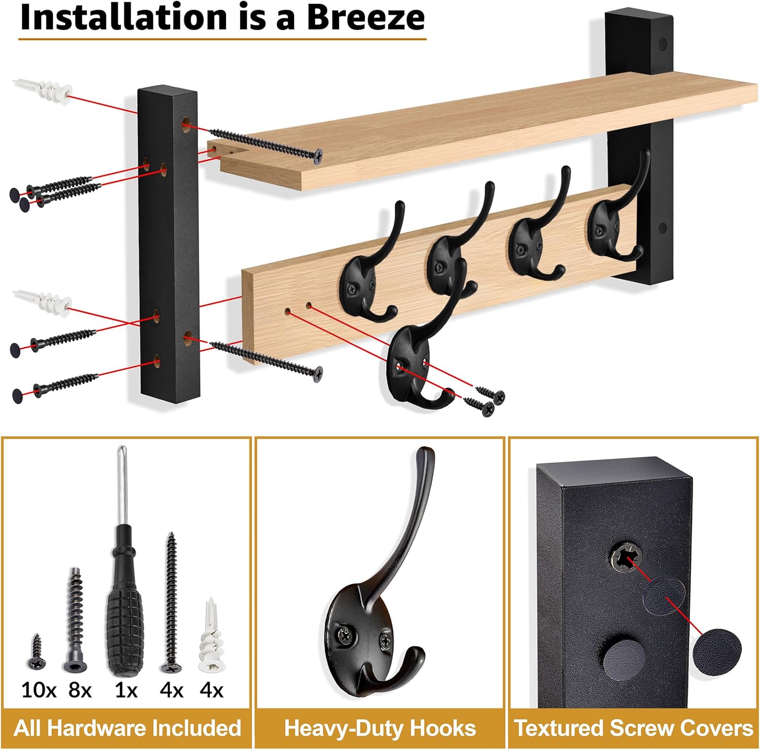 - Easy Installation, All Hardware Included – Labeled parts and step-by-step instructions make installation a breeze. Comes with screws, drywall anchors, mini level, screwdriver, and textured screw covering stickers for a clean finish. Measures approximately 23.6 L x 7.5 W x 4.7 D.